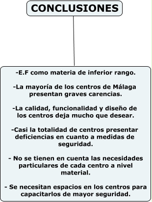 Este Cmap, tiene información relacionada con: CONCLUSIONES, CONCLUSIONES ???? -E.F como materia de inferior rango. -La mayoría de los centros de Málaga presentan graves carencias. -La calidad, funcionalidad y diseño de los centros deja mucho que desear. -Casi la totalidad de centros presentar deficiencias en cuanto a medidas de seguridad. - No se tienen en cuenta las necesidades particulares de cada centro a nivel material. - Se necesitan espacios en los centros para capacitarlos de mayor seguridad.