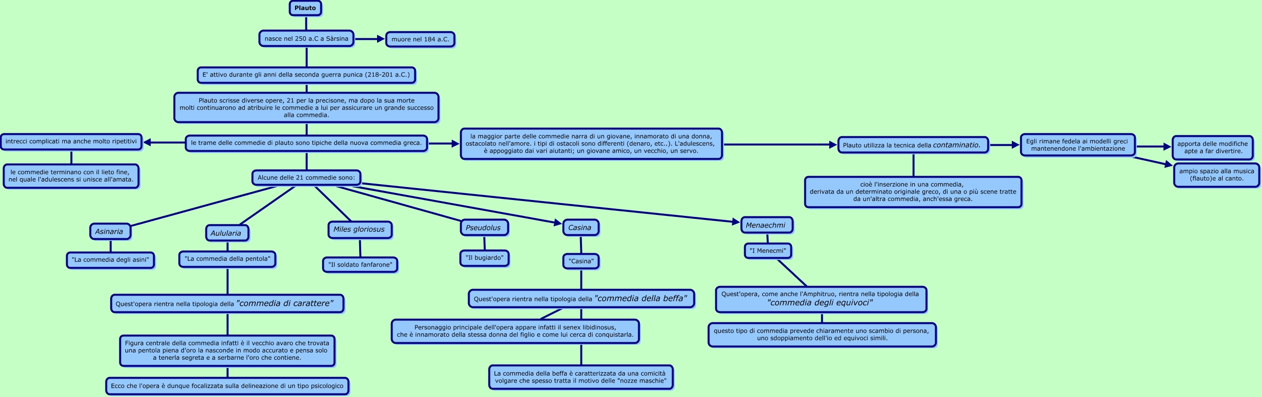 Questa Cmap, creata con IHMC CmapTools, contiene informazioni relative a: Plauto -Luca Pasta-, E' attivo durante gli anni della seconda guerra punica (218-201 a.C.) Plauto scrisse diverse opere, 21 per la precisone, ma dopo la sua morte molti continuarono ad atribuire le commedie a lui per assicurare un grande successo alla commedia., Casina "Casina", Alcune delle 21 commedie sono: Menaechmi, le trame delle commedie di plauto sono tipiche della nuova commedia greca. la maggior parte delle commedie narra di un giovane, innamorato di una donna, ostacolato nell'amore. i tipi di ostacoli sono differenti (denaro, etc..). L'adulescens, è appoggiato dai vari aiutanti; un giovane amico, un vecchio, un servo., Quest'opera rientra nella tipologia della "commedia della beffa" La commedia della beffa è caratterizzata da una comicità volgare che spesso tratta il motivo delle "nozze maschie", nasce nel 250 a.C a Sàrsina E' attivo durante gli anni della seconda guerra punica (218-201 a.C.), Plauto scrisse diverse opere, 21 per la precisone, ma dopo la sua morte molti continuarono ad atribuire le commedie a lui per assicurare un grande successo alla commedia. le trame delle commedie di plauto sono tipiche della nuova commedia greca., Asinaria "La commedia degli asini", Aulularia "La commedia della pentola", Plauto utilizza la tecnica della contaminatio. cioè l'inserzione in una commedia, derivata da un determinato originale greco, di una o più scene tratte da un'altra commedia, anch'essa greca., Alcune delle 21 commedie sono: Asinaria, Menaechmi "I Menecmi", "I Menecmi" Quest'opera, come anche l'Amphitruo, rientra nella tipologia della "commedia degli equivoci", Plauto utilizza la tecnica della contaminatio. Egli rimane fedela ai modelli greci mantenendone l'ambientazione, "La commedia della pentola" Quest'opera rientra nella tipologia della "commedia di carattere", intrecci complicati ma anche molto ripetitivi le commedie terminano con il lieto fine, nel quale l'adulescens si unisce all'amata., Egli rimane fedela ai modelli greci mantenendone l'ambientazione ampio spazio alla musica (flauto)e al canto., nasce nel 250 a.C a Sàrsina muore nel 184 a.C., Plauto nasce nel 250 a.C a Sàrsina, le trame delle commedie di plauto sono tipiche della nuova commedia greca. intrecci complicati ma anche molto ripetitivi
