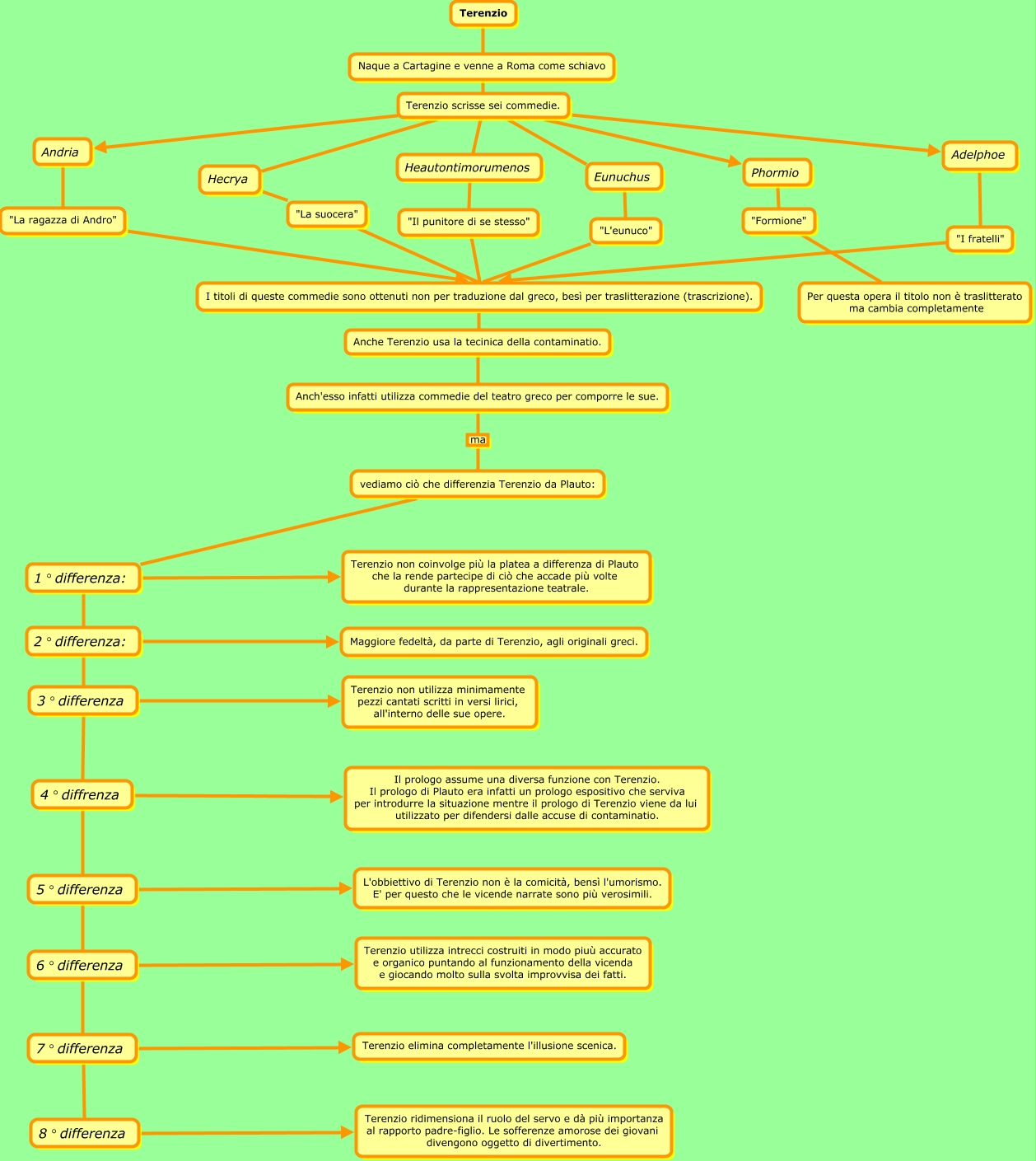Questa Cmap, creata con IHMC CmapTools, contiene informazioni relative a: Terenzio -Luca Pasta-, 8° differenza Terenzio ridimensiona il ruolo del servo e dà più importanza al rapporto padre-figlio. Le sofferenze amorose dei giovani divengono oggetto di divertimento., Andria "La ragazza di Andro", 3° differenza 4° diffrenza, "La suocera" I titoli di queste commedie sono ottenuti non per traduzione dal greco, besì per traslitterazione (trascrizione)., 2° differenza: 3° differenza, I titoli di queste commedie sono ottenuti non per traduzione dal greco, besì per traslitterazione (trascrizione). Anche Terenzio usa la tecinica della contaminatio., "La ragazza di Andro" I titoli di queste commedie sono ottenuti non per traduzione dal greco, besì per traslitterazione (trascrizione)., 7° differenza 8° differenza, Anche Terenzio usa la tecinica della contaminatio. Anch'esso infatti utilizza commedie del teatro greco per comporre le sue., "I fratelli" I titoli di queste commedie sono ottenuti non per traduzione dal greco, besì per traslitterazione (trascrizione)., 6° differenza Terenzio utilizza intrecci costruiti in modo piuù accurato e organico puntando al funzionamento della vicenda e giocando molto sulla svolta improvvisa dei fatti., Heautontimorumenos "Il punitore di se stesso", Eunuchus "L'eunuco", "L'eunuco" I titoli di queste commedie sono ottenuti non per traduzione dal greco, besì per traslitterazione (trascrizione)., Phormio "Formione", Terenzio scrisse sei commedie. Hecrya, 5° differenza 6° differenza, Terenzio scrisse sei commedie. Andria, Terenzio scrisse sei commedie. Eunuchus, 4° diffrenza 5° differenza