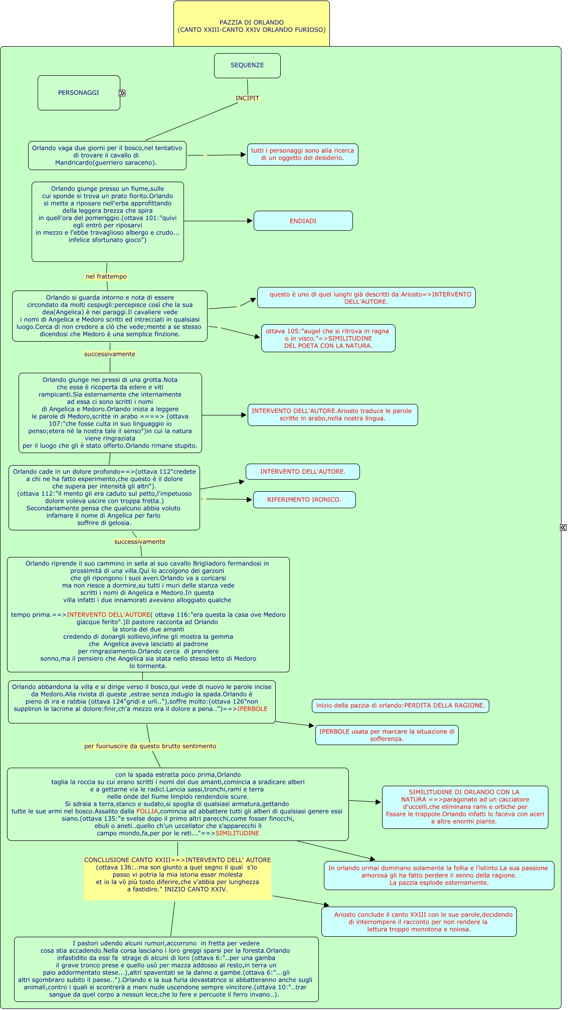 Questa Cmap, creata con IHMC CmapTools, contiene informazioni relative a: PAZZIA DI ORLANDO ARIANNA, Orlando si guarda intorno e nota di essere circondato da molti cespugli:percepisce così che la sua dea(Angelica) è nei paraggi.Il cavaliere vede i nomi di Angelica e Medoro scritti ed intrecciati in qualsiasi luogo.Cerca di non credere a ciò che vede;mente a se stesso dicendosi che Medoro è una semplice finzione. ottava 105:"augel che si ritrova in ragna o in visco."=>SIMILITUDINE DEL POETA CON LA NATURA., PERSONAGGI Orlando, Orlando giunge presso un fiume,sulle cui sponde si trova un prato fiorito.Orlando si mette a riposare nell'erba approfittando della leggera brezza che spira in quell'ora del pomeriggio.(ottava 101:"quivi egli entrò per riposarvi in mezzo e l'ebbe travaglioso albergo e crudo... infelice sfortunato gioco") nel frattempo Orlando si guarda intorno e nota di essere circondato da molti cespugli:percepisce così che la sua dea(Angelica) è nei paraggi.Il cavaliere vede i nomi di Angelica e Medoro scritti ed intrecciati in qualsiasi luogo.Cerca di non credere a ciò che vede;mente a se stesso dicendosi che Medoro è una semplice finzione., con la spada estratta poco prima,Orlando taglia la roccia su cui erano scritti i nomi dei due amanti,comincia a sradicare alberi e a gettarne via le radici.Lancia sassi,tronchi,rami e terra nelle onde del fiume limpido rendendole scure. Si sdraia a terra,stanco e sudato,si spoglia di qualsiasi armatura,gettando tutte le sue armi nel bosco.Assalito dalla FOLLIA,comincia ad abbattere tutti gli alberi di qualsiasi genere essi siano.(ottava 135:"e svelse dopo il primo altri parecchi,come fosser finocchi, ebuli o aneti..quello ch'un uccellator che s'apparecchi il campo mondo,fa,per por le reti..."==>SIMILITUDINE CONCLUSIONE CANTO XXIII==>INTERVENTO DELL' AUTORE (ottava 136:..ma son giunto a quel segno il qual s'io passo vi potria la mia istoria esser molesta et io la vò più tosto diferire,che v'abbia per lunghezza a fastidire." INIZIO CANTO XXIV. I pastori udendo alcuni rumori,accorrono in fretta per vedere cosa stia accadendo.Nella corsa lasciano i loro greggi sparsi per la foresta.Orlando infastidito da essi fa strage di alcuni di loro (ottava 6:"..per una gamba il grave tronco prese e quello usò per mazza addosso al resto,in terra un paio addormentato stese...),altri spaventati se la danno a gambe.(ottava 6:"...gli altri sgombraro subito il paese..").Orlando e la sua furia devastatrice si abbatteranno anche sugli animali,contro i quali si scontrerà a mani nude uscendone sempre vincitore.(ottava 10:"..trar sangue da quel corpo a nessun lece,che lo fere e percuote il ferro invano..)., PERSONAGGI Mandricardo, PERSONAGGI Brigliadoro, PERSONAGGI Garzoni, Orlando cade in un dolore profondo==>(ottava 112"credete a chi ne ha fatto esperimento,che questo è il dolore che supera per intensità gli altri"). (ottava 112:"il mento gli era caduto sul petto,l'impetuoso dolore voleva uscire con troppa fretta.) Secondariamente pensa che qualcuno abbia voluto infamare il nome di Angelica per farlo soffrire di gelosia. successivamente Orlando riprende il suo cammino in sella al suo cavallo Brigliadoro fermandosi in prossimità di una villa.Qui lo accolgono dei garzoni che gli ripongono i suoi averi.Orlando va a coricarsi ma non riesce a dormire,su tutti i muri delle stanza vede scritti i nomi di Angelica e Medoro.In questa villa infatti i due innamorati avevano alloggiato qualche tempo prima.==>INTERVENTO DELL'AUTORE( ottava 116:"era questa la casa ove Medoro giacque ferito".)Il pastore racconta ad Orlando la storia dei due amanti credendo di donargli sollievo,infine gli mostra la gemma che Angelica aveva lasciato al padrone per ringraziamento.Orlando cerca di prendere sonno,ma il pensiero che Angelica sia stata nello stesso letto di Medoro lo tormenta., Orlando si guarda intorno e nota di essere circondato da molti cespugli:percepisce così che la sua dea(Angelica) è nei paraggi.Il cavaliere vede i nomi di Angelica e Medoro scritti ed intrecciati in qualsiasi luogo.Cerca di non credere a ciò che vede;mente a se stesso dicendosi che Medoro è una semplice finzione. questo è uno di quei luoghi già descritti da Ariosto=>INTERVENTO DELL'AUTORE., Orlando abbandona la villa e si dirige verso il bosco,qui vede di nuovo le parole incise da Medoro.Alla rivista di queste ,estrae senza indugio la spada.Orlando è pieno di ira e rabbia (ottava 124"gridi e urli.."),soffre molto:(ottava 126"non suppliron le lacrime al dolore:finir,ch'a mezzo era il dolore a pena..")==>IPERBOLE ???? IPERBOLE usata per marcare la situazione di sofferenza., con la spada estratta poco prima,Orlando taglia la roccia su cui erano scritti i nomi dei due amanti,comincia a sradicare alberi e a gettarne via le radici.Lancia sassi,tronchi,rami e terra nelle onde del fiume limpido rendendole scure. Si sdraia a terra,stanco e sudato,si spoglia di qualsiasi armatura,gettando tutte le sue armi nel bosco.Assalito dalla FOLLIA,comincia ad abbattere tutti gli alberi di qualsiasi genere essi siano.(ottava 135:"e svelse dopo il primo altri parecchi,come fosser finocchi, ebuli o aneti..quello ch'un uccellator che s'apparecchi il campo mondo,fa,per por le reti..."==>SIMILITUDINE ???? In orlando ormai dominano solamente la follia e l'istinto.La sua passione amorosa gli ha fatto perdere il senno della ragione. La pazzia esplode esternamente., Orlando abbandona la villa e si dirige verso il bosco,qui vede di nuovo le parole incise da Medoro.Alla rivista di queste ,estrae senza indugio la spada.Orlando è pieno di ira e rabbia (ottava 124"gridi e urli.."),soffre molto:(ottava 126"non suppliron le lacrime al dolore:finir,ch'a mezzo era il dolore a pena..")==>IPERBOLE per fuoriuscire da questo brutto sentimento con la spada estratta poco prima,Orlando taglia la roccia su cui erano scritti i nomi dei due amanti,comincia a sradicare alberi e a gettarne via le radici.Lancia sassi,tronchi,rami e terra nelle 
