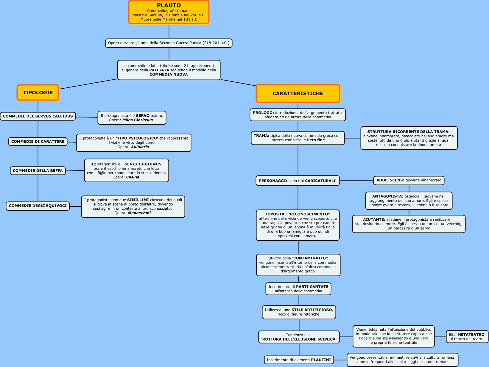 Questa Cmap, creata con IHMC CmapTools, contiene informazioni relative a: Plauto-Ghirardi Chiara, COMMEDIE DI CARATTERE COMMEDIE DELLA BEFFA, PROLOGO: introduzione dell'argomento trattato affidata ad un attore della commedia. TRAMA: tipica della nuova commedia greca con intrecci complessi e lieto fine, Inserimento di elementi PLAUTINI Vengono presentati riferimenti relativi alla cultura romana, come le frequenti allusioni a leggi e costumi romani., Utilizzo della 'CONTAMINATIO': vengono inseriti all'interno della commedia alcune scene tratte da un'altra commedia d'argomento greco. Inserimento di PARTI CANTATE all'interno della commedia, PERSONAGGI: sono tipi CARICATURALI TOPOS DEL 'RICONOSCIMENTO': al termine della vicenda viene scoperto che una ragazza povera o che sta per cadere nelle grinfie di un lenone è in verità figlia di una buona famiglia e può quindi sposarsi con l'amato., Le commedie a lui attribuite sono 21, appartenenti al genere della PALLIATA seguendo il modello della COMMEDIA NUOVA CARATTERISTICHE, ADULESCENS: giovane innamorato ANTAGONISTA: ostacola il giovane nel raggiungimento del suo amore. Egli è spesso il padre avaro e severo, il lenone o il soldato, Utilizzo di uno STILE ARTIFICIOSO, ricco di figure retoriche Tendenza alla 'ROTTURA DELL'ILLUSIONE SCENICA', PLAUTO Commediografo romano .Nasce a Sarsìna, in Umnbia nel 250 a.C. .Muore nelle Marche nel 184 a.C. Opera durante gli anni della Seconda Guerra Punica (218-201 a.C.), Opera durante gli anni della Seconda Guerra Punica (218-201 a.C.) Le commedie a lui attribuite sono 21, appartenenti al genere della PALLIATA seguendo il modello della COMMEDIA NUOVA, COMMEDIE DELLA BEFFA Il protagonista è il SENEX LIBIDINUS ossia il vecchio innamorato che lotta con il figlio per conquistare la stessa donna. Opera: Casina, PERSONAGGI: sono tipi CARICATURALI ADULESCENS: giovane innamorato, CARATTERISTICHE PROLOGO: introduzione dell'argomento trattato affidata ad un attore della commedia., Viene richiamata l'attenzione del pubblico in modo tale che lo spettatore capisca che l'opera a cui sta assistendo è una vera e propria finzione teatrale ES: 'METATEATRO' il teatro nel teatro, Tendenza alla 'ROTTURA DELL'ILLUSIONE SCENICA' Viene richiamata l'attenzione del pubblico in modo tale che lo spettatore capisca che l'opera a cui sta assistendo è una vera e propria finzione teatrale, Inserimento di PARTI CANTATE all'interno della commedia Utilizzo di uno STILE ARTIFICIOSO, ricco di figure retoriche, ANTAGONISTA: ostacola il giovane nel raggiungimento del suo amore. Egli è spesso il padre avaro e severo, il lenone o il soldato AIUTANTE: sostiene il protagonista a realizzare il suo desiderio d'amore. Egli è spesso un amico, un vecchio, un parassira o un servo, COMMEDIE DELLA BEFFA COMMEDIE DEGLI EQUIVOCI, COMMEDIE DEL SERVUS CALLIDUS COMMEDIE DI CARATTERE, TOPOS DEL 'RICONOSCIMENTO': al termine della vicenda viene scoperto che una ragazza povera o che sta per cadere nelle grinfie di un lenone è in verità figlia di una buona famiglia e può quindi sposarsi con l'amato. Utilizzo della 'CONTAMINATIO': vengono inseriti all'interno della commedia alcune scene tratte da un'altra commedia d'argomento greco.