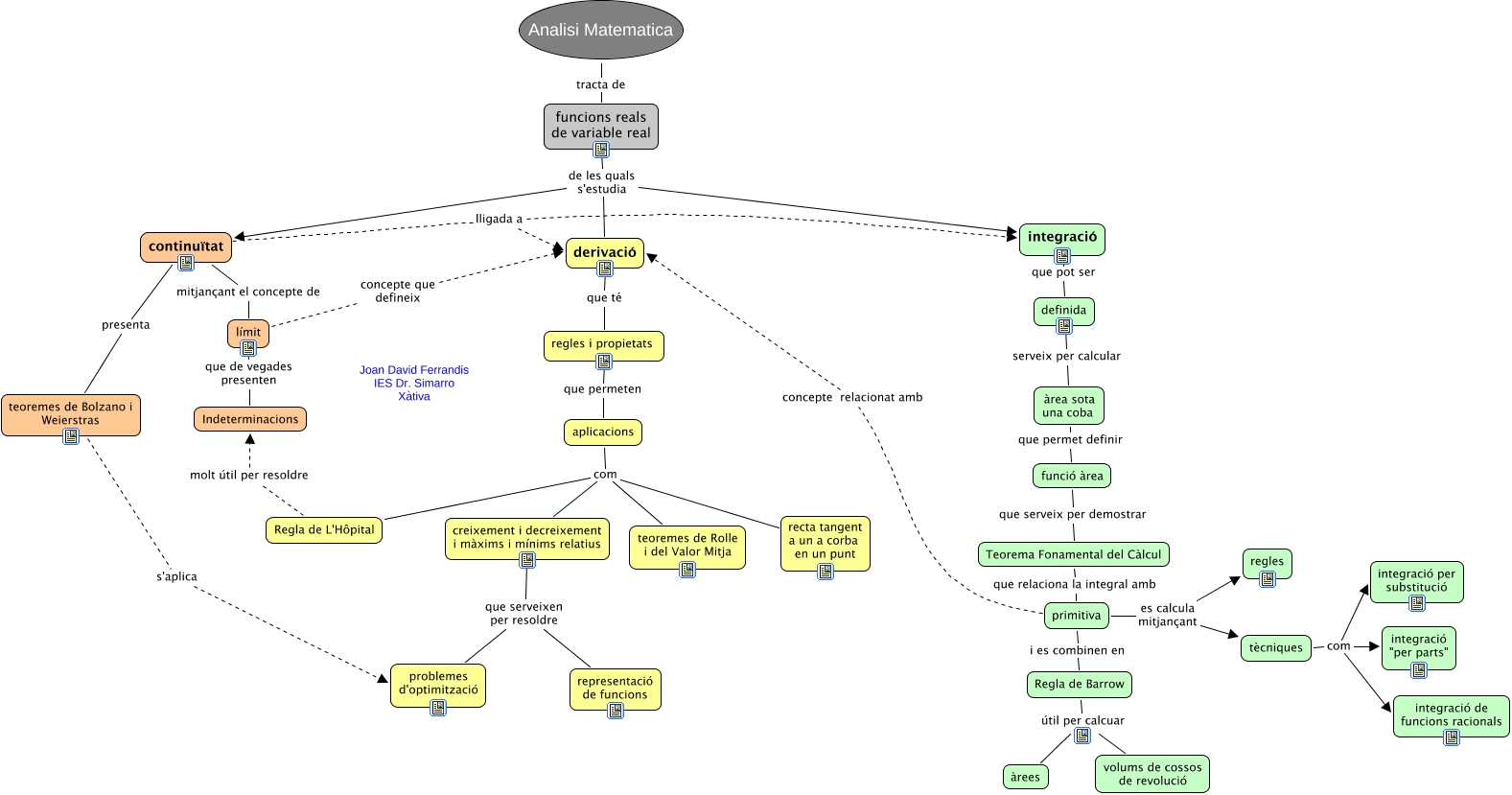 Aquest mapa conceptual conté informació relacionada amb: Anàlisi matemàtica, Analisi Matematica tracta de funcions reals de variable real, Teorema Fonamental del Càlcul que relaciona la integral amb primitiva, primitiva es calcula mitjançant tècniques, definida serveix per calcular àrea sota una coba, límit concepte que defineix derivació, primitiva es calcula mitjançant regles, aplicacions com creixement i decreixement i màxims i mínims relatius, Regla de L'Hôpital molt útil per resoldre Indeterminacions, tècniques com integració de funcions racionals, continuïtat presenta teoremes de Bolzano i Weierstras, límit que de vegades presenten Indeterminacions, Regla de Barrow útil per calcuar volums de cossos de revolució, regles i propietats que permeten aplicacions, continuïtat lligada a integració, funcions reals de variable real de les quals s'estudia integració, tècniques com integració per substitució, aplicacions com recta tangent a un a corba en un punt, aplicacions com Regla de L'Hôpital, funcions reals de variable real de les quals s'estudia continuïtat, continuïtat mitjançant el concepte de límit