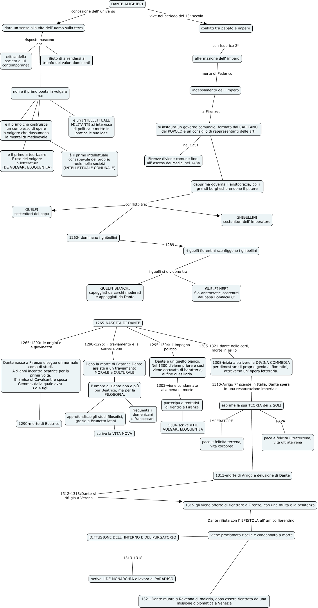 Questa Cmap, creata con IHMC CmapTools, contiene informazioni relative a: Dante-LaVita-PaolaG, l' amore di Dante non è più per Beatrice, ma per la FILOSOFIA. ???? approfondisce gli studi filosofici, grazie a Brunetto latini, 1265-NASCITA DI DANTE 1265-1290: le origini e la giovinezza Dante nasce a Firenze e segue un normale corso di studi. A 9 anni incontra beatrice per la prima volta. E' amico di Cavalcanti e sposa Gemma, dalla quale avrà 3 o 4 figli., si instaura un governo comunale, formato dal CAPITANO del POPOLO e un consiglio di rappresentanti delle arti nel 1251 Firenze diviene comune fino all' ascesa dei Medici nel 1434, esprime la sua TEORIA dei 2 SOLI IMPERATORE pace e felicità terrena, vita corporea, 1305-inizia a scrivere la DIVINA COMMEDIA per dimostrare il proprio genio ai fiorentini, attraverso un' opera letteraria. 1310-Arrigo 7° scende in Italia, Dante spera in una restaurazione imperiale 1313-morte di Arrigo e delusione di Dante, non è il primo poeta in volgare ma: ???? è il primo che costruisce un complesso di opere in volgare che riassumono la mentalità medioevale, dapprima governa l' aristocrazia, poi i grandi borghesi prendono il potere conflitto tra: 1260- dominano i ghibellini, 1265-NASCITA DI DANTE 1305-1321:dante nelle corti, morte in esilio 1305-inizia a scrivere la DIVINA COMMEDIA per dimostrare il proprio genio ai fiorentini, attraverso un' opera letteraria., -i guelfi fiorentini sconfiggono i ghibellini i guelfi si dividono tra GUELFI BIANCHI capeggiati da cerchi moderati e appoggiati da Dante, 1265-NASCITA DI DANTE 1295-1304: l' impegno politico Dante è un guelfo bianco. Nel 1300 diviene priore e così viene accusato di baratteria, al fine di esiliarlo., dapprima governa l' aristocrazia, poi i grandi borghesi prendono il potere conflitto tra: GUELFI sostenitori del papa, DANTE ALIGHIERI vive nel periodo del 13° secolo conflitti tra papato e impero, partecipa a tentativi di rientro a Firenze ???? 1304-scrive il DE VULGARI ELOQUENTIA, Dopo la morte di Beatrice Dante assiste a un traviamento MORALE e CULTURALE. l' amore di Dante non è più per Beatrice, ma per la FILOSOFIA., non è il primo poeta in volgare ma: ???? è un INTELLETTUALE MILITANTE:si interessa di politica e mette in pratica le sue idee, esprime la sua TEORIA dei 2 SOLI PAPA pace e felicità ultraterrena, vita ultraterrena, dapprima governa l' aristocrazia, poi i grandi borghesi prendono il potere conflitto tra: GHIBELLINI sostenitori dell' imperatore, viene proclamato ribelle e condannato a morte ???? DIFFUSIONE DELL' INFERNO E DEL PURGATORIO, affermazione dell' impero morte di Federico indebolimento dell' impero, viene proclamato ribelle e condannato a morte ???? 1321-Dante muore a Ravenna di malaria, dopo essere rientrato da una missione diplomatica a Venezia