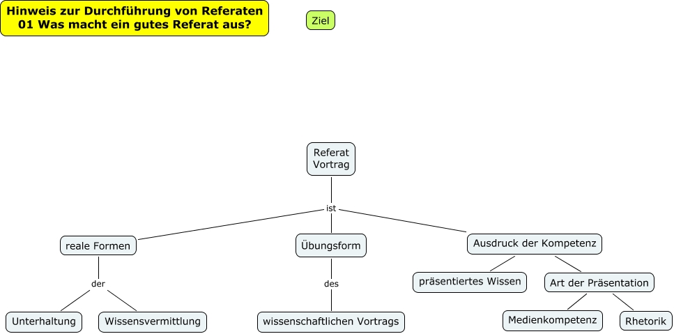Dieses mit IHMC CmapTools erstellte CMap hat Informationen bezüglich: 01 Was macht ein gutes Referat aus, Art der Präsentation Medienkompetenz, Übungsform des wissenschaftlichen Vortrags, Ausdruck der Kompetenz Art der Präsentation, reale Formen der Unterhaltung, Referat Vortrag ist Übungsform, Referat Vortrag ist Ausdruck der Kompetenz, Art der Präsentation Rhetorik, Referat Vortrag ist reale Formen, Ausdruck der Kompetenz präsentiertes Wissen, reale Formen der Wissensvermittlung