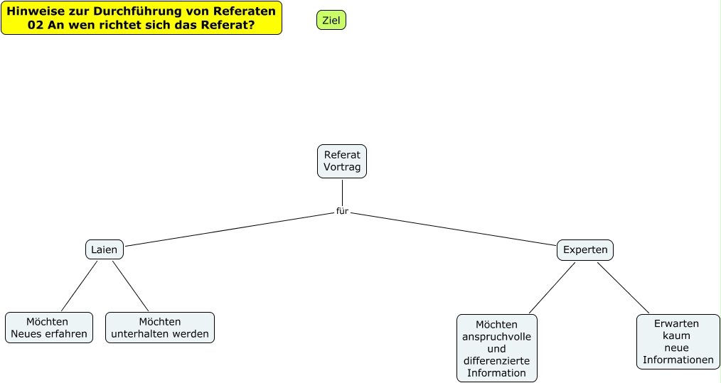 Dieses mit IHMC CmapTools erstellte CMap hat Informationen bezüglich: 02 An wen richtet sich das Referat, Experten Möchten anspruchvolle und differenzierte Information, Referat Vortrag für Experten, Laien Möchten Neues erfahren, Experten Erwarten kaum neue Informationen, Laien Möchten unterhalten werden, Referat Vortrag für Laien