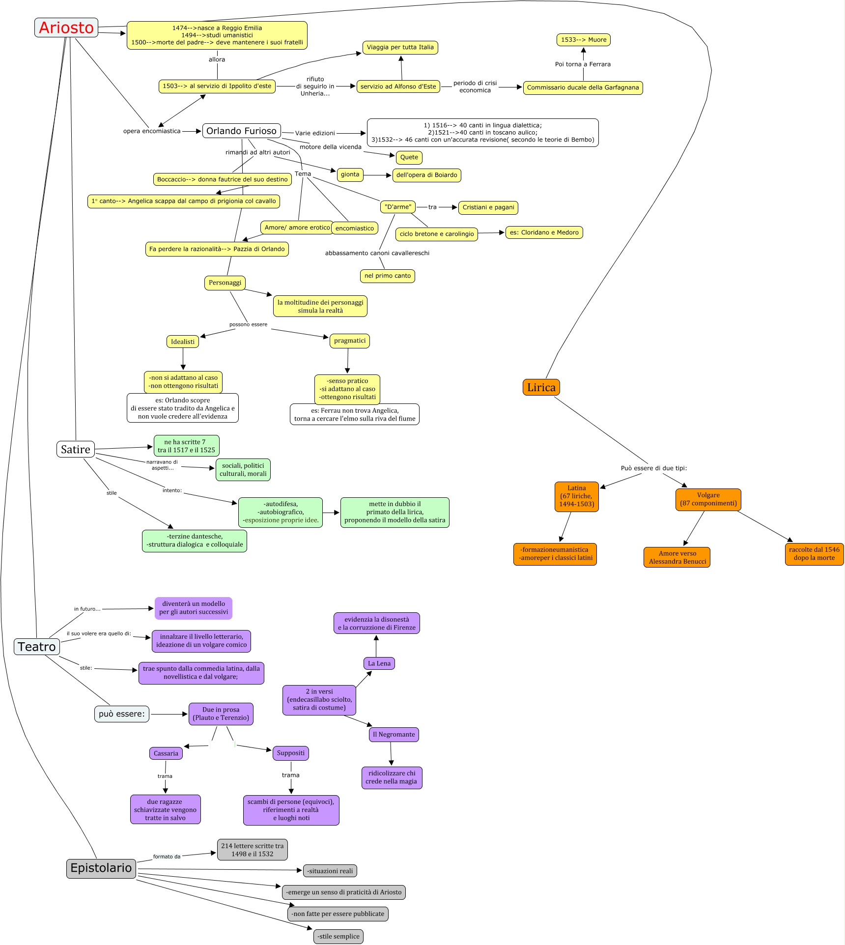 Questa Cmap, creata con IHMC CmapTools, contiene informazioni relative a: Ariosto- Benaglia Andrea, Epistolario ???? -situazioni reali, Teatro ???? può essere:, può essere: ???? Due in prosa (Plauto e Terenzio), Suppositi trama scambi di persone (equivoci), riferimenti a realtà e luoghi noti, Ariosto ???? 1474-->nasce a Reggio Emilia 1494-->studi umanistici 1500-->morte del padre--> deve mantenere i suoi fratelli, Due in prosa (Plauto e Terenzio) Suppositi, Orlando Furioso rimandi ad altri autori Boccaccio--> donna fautrice del suo destino, Orlando Furioso Tema Amore/ amore erotico, Satire narravano di aspetti... sociali, politici culturali, morali, gionta ???? dell'opera di Boiardo, 2 in versi (endecasillabo sciolto, satira di costume) ???? Il Negromante, Epistolario ???? -emerge un senso di praticità di Ariosto, 1503--> al servizio di Ippolito d'este ???? Viaggia per tutta Italia, ciclo bretone e carolingio ???? es: Cloridano e Medoro, Amore/ amore erotico ???? Fa perdere la razionalità--> Pazzia di Orlando, Epistolario ???? -stile semplice, Orlando Furioso motore della vicenda Quete, Due in prosa (Plauto e Terenzio) Cassaria, "D'arme" abbassamento canoni cavallereschi nel primo canto, La Lena ???? evidenzia la disonestà e la corruzzione di Firenze