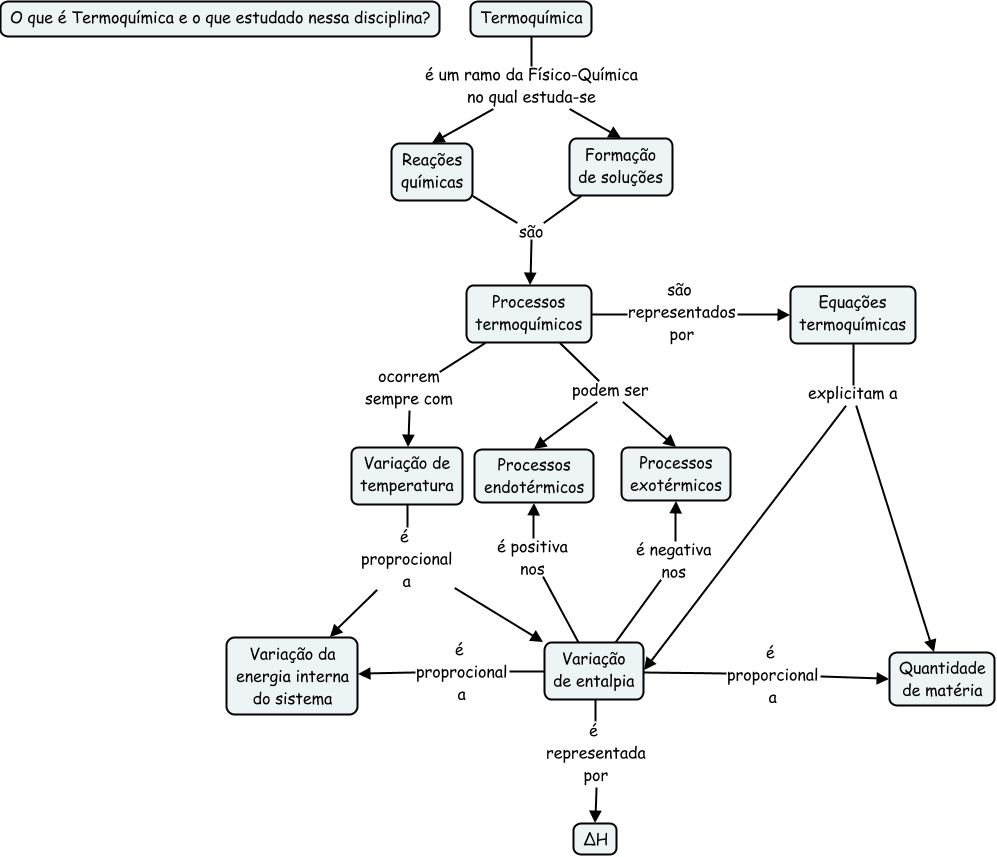Esse mapa conceitual, produzido no IHMC CmapTools, tem a informação relacionada a: O que é termoquímica, Processos termoquímicos podem ser Processos exotérmicos, Equações termoquímicas explicitam a Quantidade de matéria, Formação de soluções são Processos termoquímicos, Reações químicas são Processos termoquímicos, Variação de temperatura é proprocional a Variação de entalpia, Termoquímica é um ramo da Físico-Química no qual estuda-se Reações químicas, Termoquímica é um ramo da Físico-Química no qual estuda-se Formação de soluções, Equações termoquímicas explicitam a Variação de entalpia, Processos termoquímicos podem ser Processos endotérmicos, Variação de entalpia é representada por ∆H, Processos termoquímicos ocorrem sempre com Variação de temperatura, Variação de entalpia é proprocional a Variação da energia interna do sistema, Variação de temperatura é proprocional a Variação da energia interna do sistema, Variação de entalpia é negativa nos Processos exotérmicos, Variação de entalpia é positiva nos Processos endotérmicos, Processos termoquímicos são representados por Equações termoquímicas, Variação de entalpia é proporcional a Quantidade de matéria