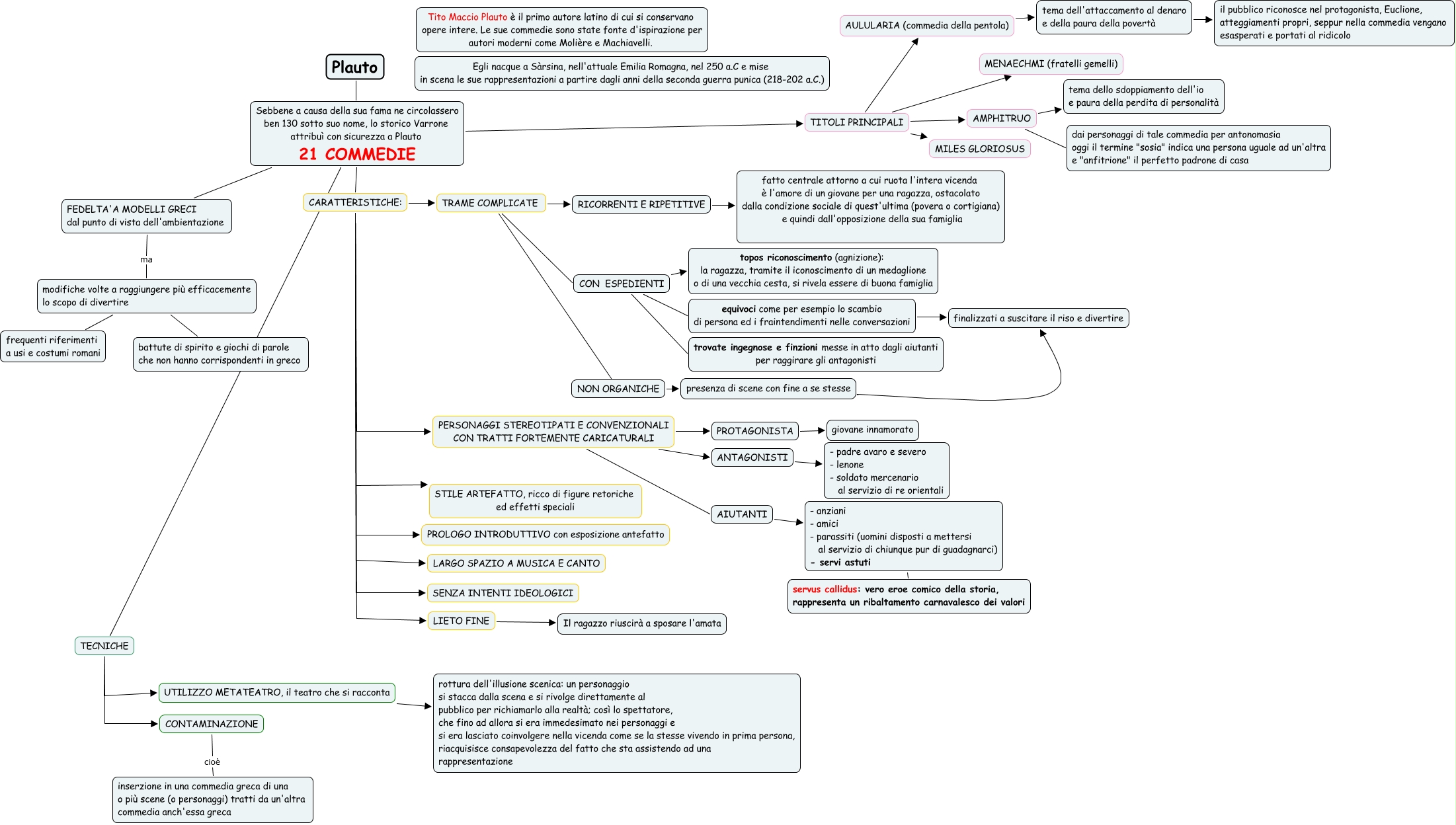 Questa Cmap, creata con IHMC CmapTools, contiene informazioni relative a: Plauto-Asia, CARATTERISTICHE: PROLOGO INTRODUTTIVO con esposizione antefatto, CARATTERISTICHE: TRAME COMPLICATE, TECNICHE UTILIZZO METATEATRO, il teatro che si racconta, AIUTANTI - anziani - amici - parassiti (uomini disposti a mettersi al servizio di chiunque pur di guadagnarci) - servi astuti, CON ESPEDIENTI equivoci come per esempio lo scambio di persona ed i fraintendimenti nelle conversazioni, presenza di scene con fine a se stesse finalizzati a suscitare il riso e divertire, AMPHITRUO tema dello sdoppiamento dell'io e paura della perdita di personalità, PERSONAGGI STEREOTIPATI E CONVENZIONALI CON TRATTI FORTEMENTE CARICATURALI ANTAGONISTI, modifiche volte a raggiungere più efficacemente lo scopo di divertire battute di spirito e giochi di parole che non hanno corrispondenti in greco, PERSONAGGI STEREOTIPATI E CONVENZIONALI CON TRATTI FORTEMENTE CARICATURALI PROTAGONISTA, CON ESPEDIENTI trovate ingegnose e finzioni messe in atto dagli aiutanti per raggirare gli antagonisti, LIETO FINE Il ragazzo riuscirà a sposare l'amata, equivoci come per esempio lo scambio di persona ed i fraintendimenti nelle conversazioni finalizzati a suscitare il riso e divertire, AMPHITRUO dai personaggi di tale commedia per antonomasia oggi il termine "sosia" indica una persona uguale ad un'altra e "anfitrione" il perfetto padrone di casa, TRAME COMPLICATE NON ORGANICHE, NON ORGANICHE presenza di scene con fine a se stesse, Sebbene a causa della sua fama ne circolassero ben 130 sotto suo nome, lo storico Varrone attribuì con sicurezza a Plauto 21 COMMEDIE TITOLI PRINCIPALI, PROTAGONISTA giovane innamorato, TRAME COMPLICATE RICORRENTI E RIPETITIVE, CONTAMINAZIONE cioè inserzione in una commedia greca di una o più scene (o personaggi) tratti da un'altra commedia anch'essa greca