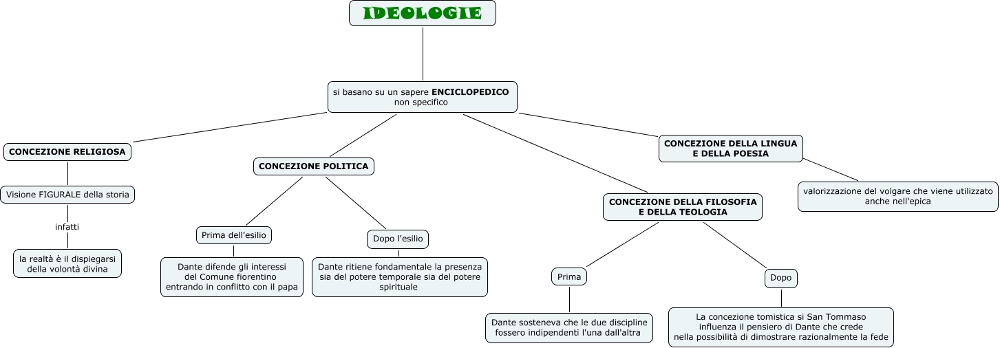 Questa Cmap, creata con IHMC CmapTools, contiene informazioni relative a: Dante (le ideologie)-Ghirardi Chiara, CONCEZIONE POLITICA Dopo l'esilio, Dopo l'esilio Dante ritiene fondamentale la presenza sia del potere temporale sia del potere spirituale, CONCEZIONE POLITICA Prima dell'esilio, Dopo La concezione tomistica si San Tommaso influenza il pensiero di Dante che crede nella possibilità di dimostrare razionalmente la fede, CONCEZIONE DELLA FILOSOFIA E DELLA TEOLOGIA Prima, si basano su un sapere ENCICLOPEDICO non specifico CONCEZIONE RELIGIOSA, CONCEZIONE DELLA FILOSOFIA E DELLA TEOLOGIA Dopo, si basano su un sapere ENCICLOPEDICO non specifico CONCEZIONE DELLA FILOSOFIA E DELLA TEOLOGIA, Visione FIGURALE della storia infatti la realtà è il dispiegarsi della volontà divina, CONCEZIONE RELIGIOSA Visione FIGURALE della storia, si basano su un sapere ENCICLOPEDICO non specifico CONCEZIONE DELLA LINGUA E DELLA POESIA, si basano su un sapere ENCICLOPEDICO non specifico CONCEZIONE POLITICA, IDEOLOGIE si basano su un sapere ENCICLOPEDICO non specifico, Prima dell'esilio Dante difende gli interessi del Comune fiorentino entrando in conflitto con il papa, CONCEZIONE DELLA LINGUA E DELLA POESIA ???? valorizzazione del volgare che viene utilizzato anche nell'epica, Prima Dante sosteneva che le due discipline fossero indipendenti l'una dall'altra