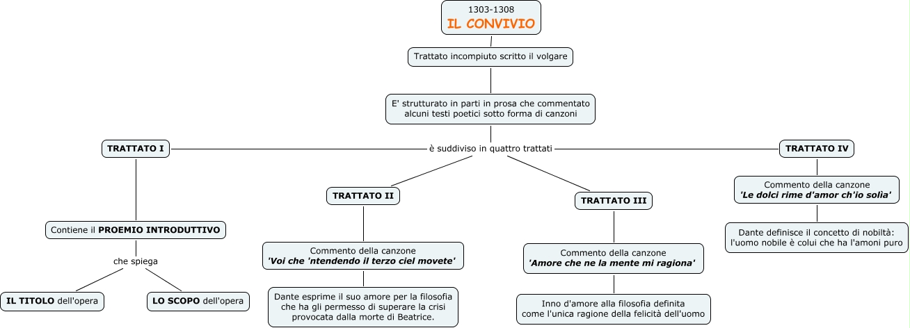 Questa Cmap, creata con IHMC CmapTools, contiene informazioni relative a: Il convivio-Dante Alighieri, Commento della canzone 'Le dolci rime d'amor ch'io solìa' Dante definisce il concetto di nobiltà: l'uomo nobile è colui che ha l'amoni puro, E' strutturato in parti in prosa che commentato alcuni testi poetici sotto forma di canzoni è suddiviso in quattro trattati TRATTATO IV, TRATTATO III Commento della canzone 'Amore che ne la mente mi ragiona', Contiene il PROEMIO INTRODUTTIVO che spiega IL TITOLO dell'opera, Contiene il PROEMIO INTRODUTTIVO che spiega LO SCOPO dell'opera, Commento della canzone 'Amore che ne la mente mi ragiona' Inno d'amore alla filosofia definita come l'unica ragione della felicità dell'uomo, E' strutturato in parti in prosa che commentato alcuni testi poetici sotto forma di canzoni è suddiviso in quattro trattati TRATTATO I, E' strutturato in parti in prosa che commentato alcuni testi poetici sotto forma di canzoni è suddiviso in quattro trattati TRATTATO III, 1303-1308 IL CONVIVIO Trattato incompiuto scritto il volgare, E' strutturato in parti in prosa che commentato alcuni testi poetici sotto forma di canzoni è suddiviso in quattro trattati TRATTATO II, Commento della canzone 'Voi che 'ntendendo il terzo ciel movete' Dante esprime il suo amore per la filosofia che ha gli permesso di superare la crisi provocata dalla morte di Beatrice., TRATTATO IV Commento della canzone 'Le dolci rime d'amor ch'io solìa', TRATTATO II Commento della canzone 'Voi che 'ntendendo il terzo ciel movete', Trattato incompiuto scritto il volgare E' strutturato in parti in prosa che commentato alcuni testi poetici sotto forma di canzoni, TRATTATO I Contiene il PROEMIO INTRODUTTIVO