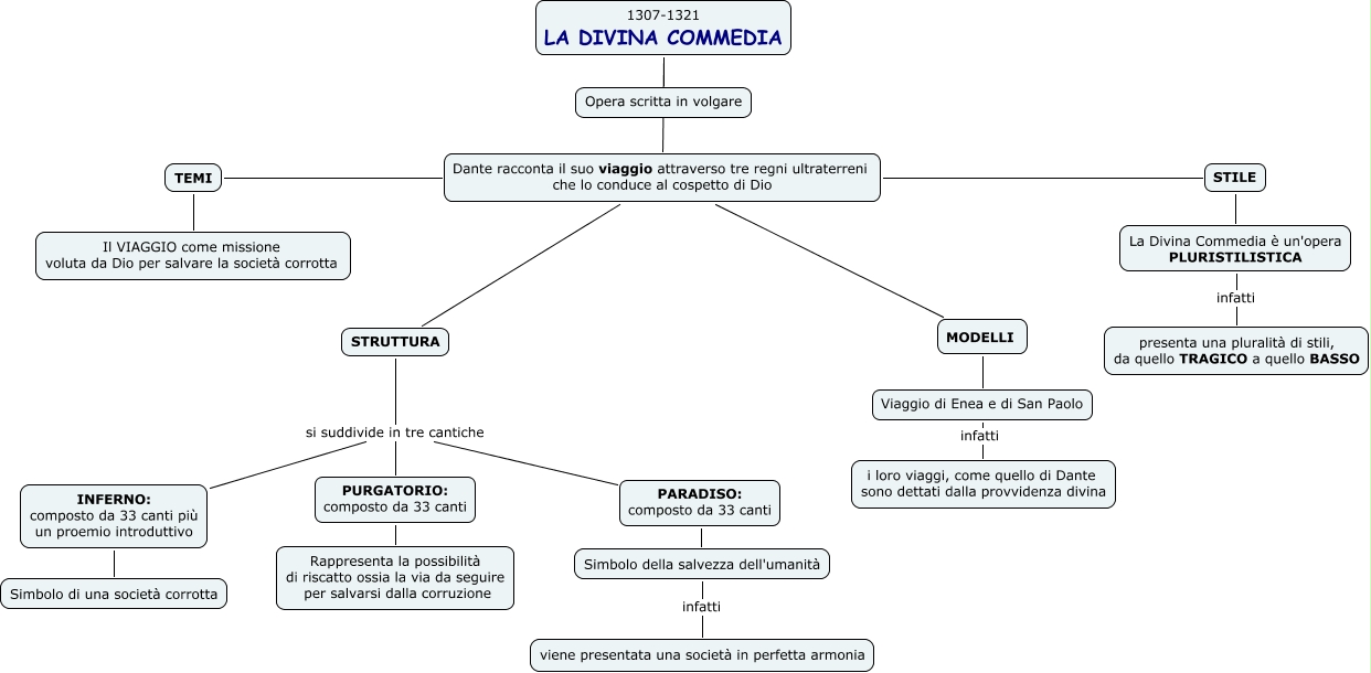 Questa Cmap, creata con IHMC CmapTools, contiene informazioni relative a: La divina commedia-Dante Alighieri, PURGATORIO: composto da 33 canti Rappresenta la possibilità di riscatto ossia la via da seguire per salvarsi dalla corruzione, Dante racconta il suo viaggio attraverso tre regni ultraterreni che lo conduce al cospetto di Dio STRUTTURA, STRUTTURA si suddivide in tre cantiche PARADISO: composto da 33 canti, STRUTTURA si suddivide in tre cantiche PURGATORIO: composto da 33 canti, Simbolo della salvezza dell'umanità infatti viene presentata una società in perfetta armonia, 1307-1321 LA DIVINA COMMEDIA Opera scritta in volgare, STILE La Divina Commedia è un'opera PLURISTILISTICA, Viaggio di Enea e di San Paolo infatti i loro viaggi, come quello di Dante sono dettati dalla provvidenza divina, MODELLI Viaggio di Enea e di San Paolo, Dante racconta il suo viaggio attraverso tre regni ultraterreni che lo conduce al cospetto di Dio MODELLI, Dante racconta il suo viaggio attraverso tre regni ultraterreni che lo conduce al cospetto di Dio TEMI, 1307-1321 LA DIVINA COMMEDIA Dante racconta il suo viaggio attraverso tre regni ultraterreni che lo conduce al cospetto di Dio, PARADISO: composto da 33 canti Simbolo della salvezza dell'umanità, STRUTTURA si suddivide in tre cantiche INFERNO: composto da 33 canti più un proemio introduttivo, INFERNO: composto da 33 canti più un proemio introduttivo Simbolo di una società corrotta, TEMI Il VIAGGIO come missione voluta da Dio per salvare la società corrotta, Dante racconta il suo viaggio attraverso tre regni ultraterreni che lo conduce al cospetto di Dio STILE, La Divina Commedia è un'opera PLURISTILISTICA infatti presenta una pluralità di stili, da quello TRAGICO a quello BASSO