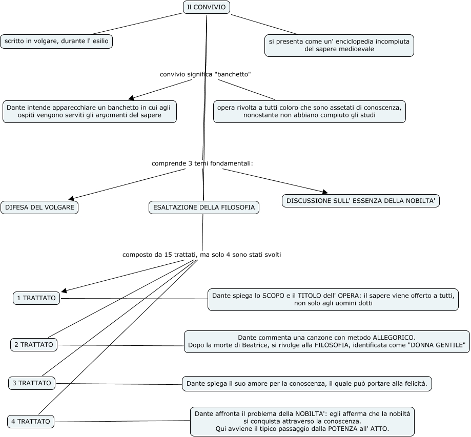Questa Cmap, creata con IHMC CmapTools, contiene informazioni relative a: IlConvivio-PaolaG, Il CONVIVIO comprende 3 temi fondamentali: DISCUSSIONE SULL' ESSENZA DELLA NOBILTA', Il CONVIVIO composto da 15 trattati, ma solo 4 sono stati svolti 1 TRATTATO, Il CONVIVIO convivio significa "banchetto" Dante intende apparecchiare un banchetto in cui agli ospiti vengono serviti gli argomenti del sapere, Il CONVIVIO composto da 15 trattati, ma solo 4 sono stati svolti 4 TRATTATO, Il CONVIVIO ???? scritto in volgare, durante l' esilio, Il CONVIVIO convivio significa "banchetto" opera rivolta a tutti coloro che sono assetati di conoscenza, nonostante non abbiano compiuto gli studi, 1 TRATTATO ???? Dante spiega lo SCOPO e il TITOLO dell' OPERA: il sapere viene offerto a tutti, non solo agli uomini dotti, 2 TRATTATO ???? Dante commenta una canzone con metodo ALLEGORICO. Dopo la morte di Beatrice, si rivolge alla FILOSOFIA, identificata come "DONNA GENTILE", 4 TRATTATO ???? Dante affronta il problema della NOBILTA': egli afferma che la nobiltà si conquista attraverso la conoscenza. Qui avviene il tipico passaggio dalla POTENZA all' ATTO., Il CONVIVIO composto da 15 trattati, ma solo 4 sono stati svolti 3 TRATTATO, Il CONVIVIO ???? si presenta come un' enciclopedia incompiuta del sapere medioevale, Il CONVIVIO comprende 3 temi fondamentali: ESALTAZIONE DELLA FILOSOFIA, Il CONVIVIO comprende 3 temi fondamentali: DIFESA DEL VOLGARE, 3 TRATTATO ???? Dante spiega il suo amore per la conoscenza, il quale può portare alla felicità., Il CONVIVIO composto da 15 trattati, ma solo 4 sono stati svolti 2 TRATTATO