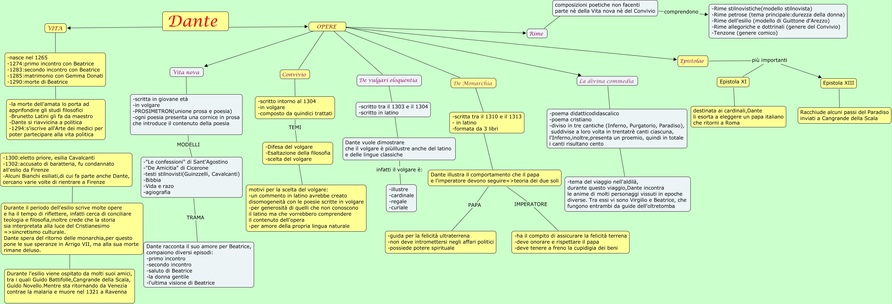 Questa Cmap, creata con IHMC CmapTools, contiene informazioni relative a: Dante-Elena Gritti, Dante illustra il comportamento che il papa e l'imperatore devono seguire=>teoria dei due soli PAPA -guida per la felicità ultraterrena -non deve intromettersi negli affari politici -possiede potere spirituale, OPERE Rime, Vita nova -scritta in giovane età -in volgare -PROSIMETRON(unione prosa e poesia) -ogni poesia presenta una cornice in prosa che introduce il contenuto della poesia, Dante illustra il comportamento che il papa e l'imperatore devono seguire=>teoria dei due soli IMPERATORE -ha il compito di assicurare la felicità terrena -deve onorare e rispettare il papa -deve tenere a freno la cupidigia dei beni, De Monarchia -scritta tra il 1310 e il 1313 - in latino -formata da 3 libri, Epistolae più importanti Epistola XI, -nasce nel 1265 -1274:primo incontro con Beatrice -1283:secondo incontro con Beatrice -1285:matrimonio con Gemma Donati -1290:morte di Beatrice -la morte dell'amata lo porta ad apprifondire gli studi filosofici -Brunetto Latini gli fa da maestro -Dante si riavvicina a politica -1294:s'iscrive all'Arte dei medici per poter partecipare alla vita politica, OPERE De Monarchia, Epistola XIII ???? Racchiude alcuni passi del Paradiso inviati a Cangrande della Scala, composizioni poetiche non facenti parte nè della Vita nova nè del Convivio comprendono -Rime stilnovistiche(modello stilnovista) -Rime petrose (tema principale:durezza della donna) -Rime dell'esilio (modello di Guittone d'Arezzo) -Rime allegoriche e dottrinali (genere del Convivio) -Tenzone (genere comico), Dante VITA, Convivio -scritto intorno al 1304 -in volgare -composto da quindici trattati, OPERE De vulgari eloquentia, -scritto intorno al 1304 -in volgare -composto da quindici trattati TEMI -Difesa del volgare -Esaltazione della filosofia -scelta del volgare, -scritto tra il 1303 e il 1304 -scritto in latino Dante vuole dimostrare che il volgare è piùillustre anche del latino e delle lingue classiche, -"Le confessioni" di Sant'Agostino -"De Amicitia" di Cicerone -testi stilnovisti(Guinzzelli, Cavalcanti) -Bibbia -Vida e razo -agiografia TRAMA Dante racconta il suo amore per Beatrice, compaiono diversi episodi: -primo incontro -secondo incontro -saluto di Beatrice -la donna gentile -l'ultima visione di Beatrice, Epistola XI ???? destinata ai cardinali,Dante li esorta a eleggere un papa italiano che ritorni a Roma, La divina commedia ???? -poema didatticodidascalico -poema cristiano -diviso in tre cantiche (Inferno, Purgatorio, Paradiso), suddivise a loro volta in trentatrè canti ciascuna, l'Inferno,inoltre,presenta un proemio, quindi in totale i canti risultano cento, Rime composizioni poetiche non facenti parte nè della Vita nova nè del Convivio, De vulgari eloquentia -scritto tra il 1303 e il 1304 -scritto in latino