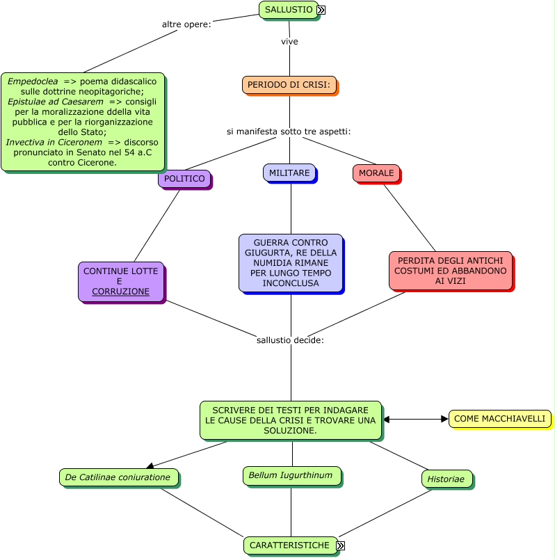 Questa Cmap, creata con IHMC CmapTools, contiene informazioni relative a: Sallustio Jessica Vanoni, Catilina analogia entrambi sono il frutto della malvagità della classe senatoria., SALLUSTIO vive PERIODO DI CRISI:, 50 a.C viene accusato di probrum partecipa a fianco di Cesare alla guerra civile, Giugurta analogia entrambi sono il frutto della malvagità della classe senatoria., indagare il passato per comprendere il presente utilizza stile austero, coinciso, PERIODO DI CRISI: si manifesta sotto tre aspetti: MORALE, De Catilinae coniuratione ???? CARATTERISTICHE, tema platonico del dualismo dell'essere umano Bellum Iugurthinum capitolo 2: "Nam uti genus hominum compositum ex corpore et anima est, ita res cuncta studiaque omnia nostra corporis alia, alia animi naturam secuntur. Igitur praeclara facies, magnae divitiae, ad hoc vis corporis et alia omnia huiusce modi brevi dilabuntur; at ingeni egregia facinora sicuti anima immortalia sunt.", narra il periodo di tempo compreso tra il 78 e il 67 a.C. corruzione, personaggi Giugurta, riflessione sulla storia e sul ruolo dello storico ricorrendo tema platonico del dualismo dell'essere umano, PERIODO DI CRISI: si manifesta sotto tre aspetti: MILITARE, indagare il passato per comprendere il presente utilizza excursus, 44 a.C. abbandona la vita politica si dedica storiografia, MILITARE ???? GUERRA CONTRO GIUGURTA, RE DELLA NUMIDIA RIMANE PER LUNGO TEMPO INCONCLUSA, tema platonico del dualismo dell'essere umano ???? De Catilinae Coniuratione capitolo 1: "Sed nostra omnis vis in animo et corpore sita est: animi imperio, corporis servitio magis utimur; alterum nobis cum dis, alterum cum beluis commune est. Quo mihi rectius videtur ingeni quam virium opibus gloriam quaerere..., dopo la terza guerra punica (146 a.C.) poichè diffusione dell'avaritia e dell'ambitio soprattutto sotto la dittatura di Silla., GUERRA CONTRO GIUGURTA, RE DELLA NUMIDIA RIMANE PER LUNGO TEMPO INCONCLUSA sallustio decide: SCRIVERE DEI TESTI PER INDAGARE LE CAUSE DELLA CRISI E TROVARE UNA SOLUZIONE., MORALE ???? PERDITA DEGLI ANTICHI COSTUMI ED ABBANDONO AI VIZI, SCRIVERE DEI TESTI PER INDAGARE LE CAUSE DELLA CRISI E TROVARE UNA SOLUZIONE. ???? Historiae