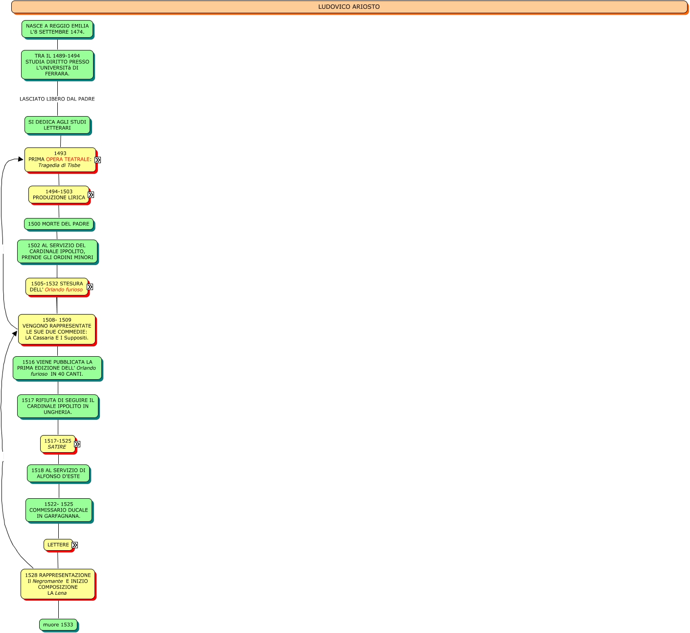 Questa Cmap, creata con IHMC CmapTools, contiene informazioni relative a: Ariosto Jessica Vanoni, quete (inchiesta) => è generato dall'amore, dal motivo encomiastico, dalla guerra. "poema del movimento" Calvino, Suppositi: scambi di persona è in prosa, 1500 MORTE DEL PADRE ???? 1502 AL SERVIZIO DEL CARDINALE IPPOLITO, PRENDE GLI ORDINI MINORI, ORLANDO FURIOSO è gionta dell' Orlando innamorato, linguaggio comico in volgare lessico basso, gergale, dialettale, Ariosto immagina di colloquiare con amici e parenti. quindi tono confidenziale, ORLANDO FURIOSO personaggi, 1517-1525 SATIRE 1518 AL SERVIZIO DI ALFONSO D'ESTE, SATIRE modello Orazio, volgare 87, amore (2 ottava del 1 canto) Ruggero e Bradamante, struttura dialogica poichè Ariosto è consapevole di essere portatore del proprio punto di vista => il dialogo mette la verità in discussione, ORLANDO FURIOSO si possono individuare tre filoni amore (2 ottava del 1 canto), SATIRE 7, pragmatici: Cloridano. Ferraù... si adattano al caso, varietas => principio estetico che sottintende la visione del mondo dell'autore opera aperta "che si rifiuta di cominciare e di finire", LETTERE ???? 214, 1517 RIFIUTA DI SEGUIRE IL CARDINALE IPPOLITO IN UNGHERIA. ???? 1517-1525 SATIRE, TEATRO commedie: Negromante: tentativi compiuti da un giovane per conquistare l'amata., ORLANDO FURIOSO pubblicato 1516 => 40 canti => koinè padana 1521 => 40 canti => toscano illustre 1532 => 46 canti => cambiamenti linguistici secondo i dettami del Bembo.