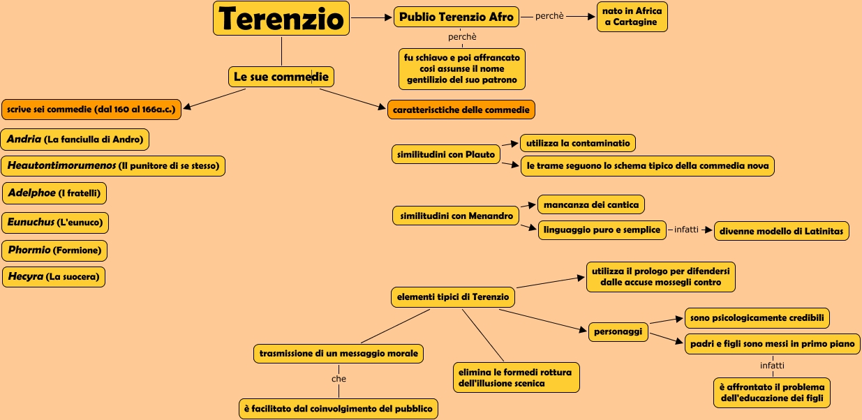 Questa Cmap, creata con IHMC CmapTools, contiene informazioni relative a: Terenzio - Rossini Paola, similitudini con Plauto utilizza la contaminatio, similitudini con Menandro mancanza dei cantica, similitudini con Menandro linguaggio puro e semplice, padri e figli sono messi in primo piano infatti è affrontato il problema dell'educazione dei figli, elementi tipici di Terenzio personaggi, similitudini con Plauto le trame seguono lo schema tipico della commedia nova, Le sue commedie scrive sei commedie (dal 160 al 166a.c.), personaggi sono psicologicamente credibili, Terenzio Le sue commedie, elementi tipici di Terenzio elimina le formedi rottura dell'illusione scenica, Terenzio Publio Terenzio Afro, Publio Terenzio Afro perchè nato in Africa a Cartagine, elementi tipici di Terenzio utilizza il prologo per difendersi dalle accuse mossegli contro, linguaggio puro e semplice infatti divenne modello di Latinitas, personaggi padri e figli sono messi in primo piano, Le sue commedie caratterisctiche delle commedie, Publio Terenzio Afro perchè fu schiavo e poi affrancato cosi assunse il nome gentilizio del suo patrono, elementi tipici di Terenzio trasmissione di un messaggio morale, trasmissione di un messaggio morale che è facilitato dal coinvolgimento del pubblico