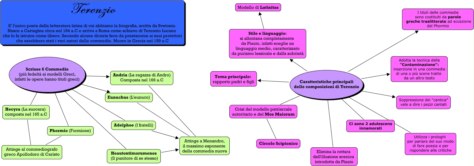 Questa Cmap, creata con IHMC CmapTools, contiene informazioni relative a: Terenzio-Veronica, Heautontimorumenos (Il punitore di se stesso) Attinge a Menandro, il massimo esponente della commedia nuova, Scrisse 6 Commedie (più fedeltà ai modelli Greci, infatti le opere hanno titoli greci) Hecyra (La suocera) composta nel 165 a.C, Scrisse 6 Commedie (più fedeltà ai modelli Greci, infatti le opere hanno titoli greci) Adelphoe (I fratelli), Stile e linguaggio: si allontana completamente da Plauto, infatti sceglie un linguaggio medio, caratterizzato da purismo lessicale e dalla sobrietà Modello di Latinitas, Caratteristiche principali delle composizioni di Terenzio Utilizza i prologhi per parlare del suo modo di fare poesia e per rispondere alle critiche, Hecyra (La suocera) composta nel 165 a.C Attinge al commediografo greco Apollodoro di Caristo, Crisi del modello patriarcale autoritario e del Mos Maiorum Circolo Scipionico, Phormio (Formione) Attinge al commediografo greco Apollodoro di Caristo, Andria (La ragazza di Andro) Composta nel 166 a.C Attinge a Menandro, il massimo esponente della commedia nuova, Caratteristiche principali delle composizioni di Terenzio Ci sono 2 adulescens innamorati, Scrisse 6 Commedie (più fedeltà ai modelli Greci, infatti le opere hanno titoli greci) Phormio (Formione), Adelphoe (I fratelli) Attinge a Menandro, il massimo esponente della commedia nuova, Scrisse 6 Commedie (più fedeltà ai modelli Greci, infatti le opere hanno titoli greci) Andria (La ragazza di Andro) Composta nel 166 a.C, Scrisse 6 Commedie (più fedeltà ai modelli Greci, infatti le opere hanno titoli greci) Eunuchus (L'eunuco), Caratteristiche principali delle composizioni di Terenzio Tema principale: rapporto padri e figli, Caratteristiche principali delle composizioni di Terenzio I titoli delle commedie sono costituiti da parole greche traslitterate ad eccezione del Phormio, Scrisse 6 Commedie (più fedeltà ai modelli Greci, infatti le opere hanno titoli greci) Heautontimorumenos (Il punitore di se stesso), Caratteristiche principali delle composizioni di Terenzio Crisi del modello patriarcale autoritario e del Mos Maiorum, Caratteristiche principali delle composizioni di Terenzio Stile e linguaggio: si allontana completamente da Plauto, infatti sceglie un linguaggio medio, caratterizzato da purismo lessicale e dalla sobrietà, Caratteristiche principali delle composizioni di Terenzio Soppressione dei "cantica" vale a dire i pezzi cantati