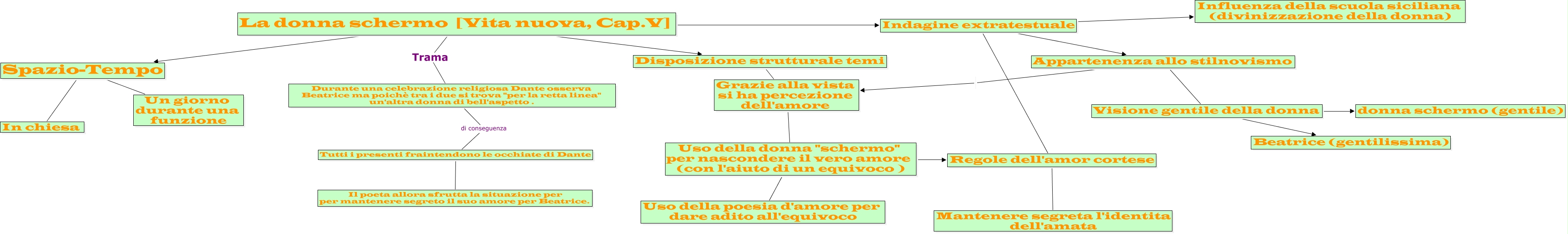 Questa Cmap, creata con IHMC CmapTools, contiene informazioni relative a: La donna schermo Matteo Cornelli, Regole dell'amor cortese Mantenere segreta l'identita dell'amata, Visione gentile della donna Beatrice (gentilissima), Appartenenza allo stilnovismo Visione gentile della donna, Spazio-Tempo In chiesa, Indagine extratestuale Appartenenza allo stilnovismo, La donna schermo [Vita nuova, Cap.V] Spazio-Tempo, Disposizione strutturale temi Grazie alla vista si ha percezione dell'amore, Uso della donna "schermo" per nascondere il vero amore (con l'aiuto di un equivoco ) Uso della poesia d'amore per dare adito all'equivoco, Indagine extratestuale Regole dell'amor cortese, La donna schermo [Vita nuova, Cap.V] Trama Durante una celebrazione religiosa Dante osserva Beatrice ma poichè tra i due si trova "per la retta linea" un'altra donna di bell'aspetto ., Appartenenza allo stilnovismo Grazie alla vista si ha percezione dell'amore, Indagine extratestuale Influenza della scuola siciliana (divinizzazione della donna), La donna schermo [Vita nuova, Cap.V] Disposizione strutturale temi, Uso della donna "schermo" per nascondere il vero amore (con l'aiuto di un equivoco ) Regole dell'amor cortese, Spazio-Tempo Un giorno durante una funzione, Grazie alla vista si ha percezione dell'amore Uso della donna "schermo" per nascondere il vero amore (con l'aiuto di un equivoco ), Durante una celebrazione religiosa Dante osserva Beatrice ma poichè tra i due si trova "per la retta linea" un'altra donna di bell'aspetto . di conseguenza Tutti i presenti fraintendono le occhiate di Dante, Visione gentile della donna donna schermo (gentile), La donna schermo [Vita nuova, Cap.V] Indagine extratestuale, Tutti i presenti fraintendono le occhiate di Dante Il poeta allora sfrutta la situazione per per mantenere segreto il suo amore per Beatrice.