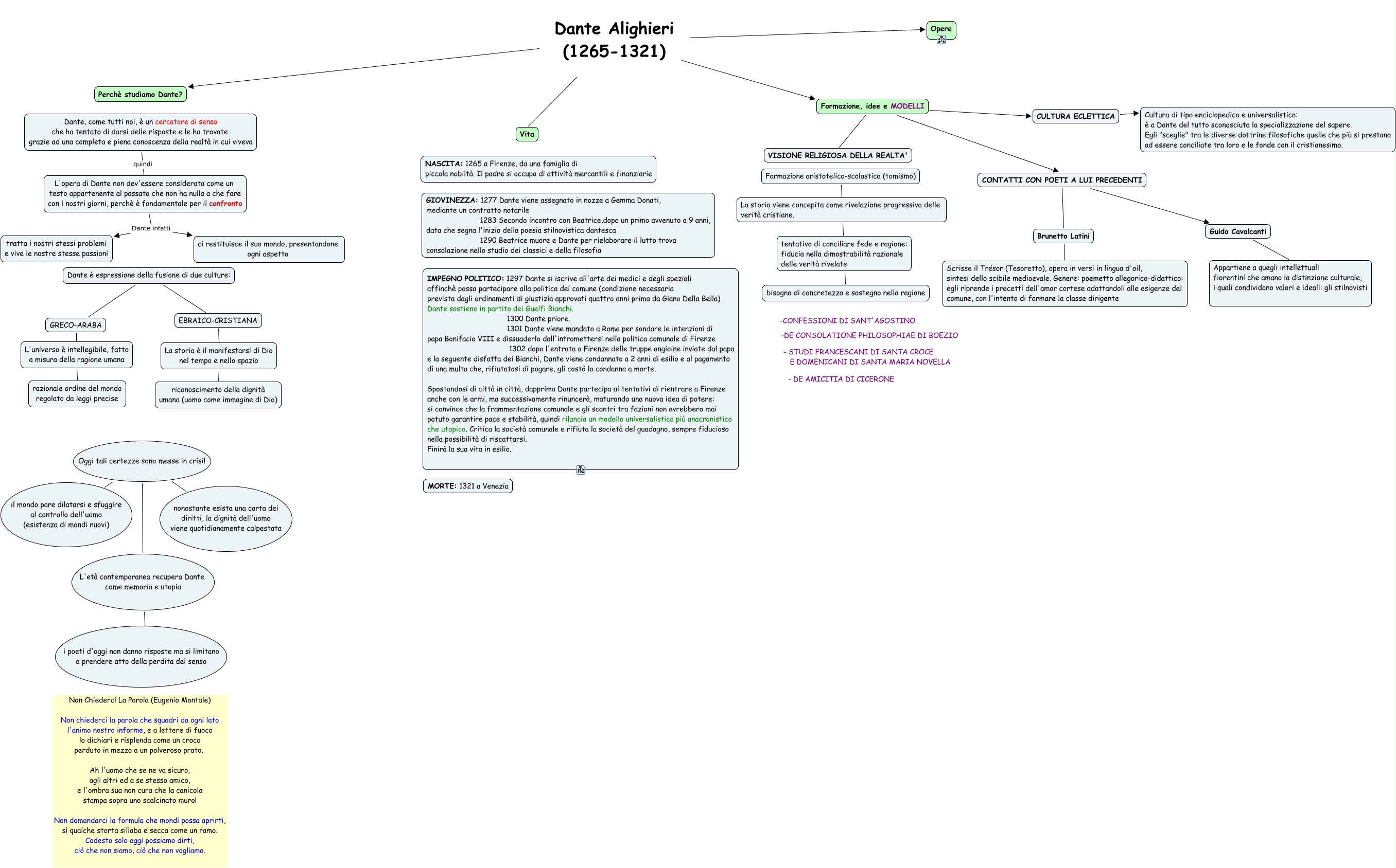 Questa Cmap, creata con IHMC CmapTools, contiene informazioni relative a: Dante-Asia, Dante è espressione della fusione di due culture: GRECO-ARABA, tentativo di conciliare fede e ragione: fiducia nella dimostrabilità razionale delle verità rivelate bisogno di concretezza e sostegno nella ragione, Dante, come tutti noi, è un cercatore di senso che ha tentato di darsi delle risposte e le ha trovate grazie ad una completa e piena conoscenza della realtà in cui viveva quindi L'opera di Dante non dev'essere considerata come un testo appartenente al passato che non ha nulla a che fare con i nostri giorni, perchè è fondamentale per il confronto, Dante Alighieri (1265-1321) Perchè studiamo Dante?, L'opera di Dante non dev'essere considerata come un testo appartenente al passato che non ha nulla a che fare con i nostri giorni, perchè è fondamentale per il confronto Dante infatti ci restituisce il suo mondo, presentandone ogni aspetto, Oggi tali certezze sono messe in crisi! nonostante esista una carta dei diritti, la dignità dell'uomo viene quotidianamente calpestata, Dante è espressione della fusione di due culture: EBRAICO-CRISTIANA, La storia viene concepita come rivelazione progressiva delle verità cristiane. tentativo di conciliare fede e ragione: fiducia nella dimostrabilità razionale delle verità rivelate, EBRAICO-CRISTIANA La storia è il manifestarsi di Dio nel tempo e nello spazio, Formazione, idee e MODELLI CULTURA ECLETTICA, Dante Alighieri (1265-1321) Opere, Dante Alighieri (1265-1321) Vita, CONTATTI CON POETI A LUI PRECEDENTI Guido Cavalcanti, Dante Alighieri (1265-1321) Formazione, idee e MODELLI, L'età contemporanea recupera Dante come memoria e utopia infatti i poeti d'oggi non danno risposte ma si limitano a prendere atto della perdita del senso, La storia è il manifestarsi di Dio nel tempo e nello spazio riconoscimento della dignità umana (uomo come immagine di Dio), Formazione aristotelico-scolastica (tomismo) La storia viene concepita come rivelazione progressiva delle verità cristiane., GRECO-ARABA L'universo è intellegibile, fatto a misura della ragione umana, CONTATTI CON POETI A LUI PRECEDENTI Brunetto Latini, Oggi tali certezze sono messe in crisi! L'età contemporanea recupera Dante come memoria e utopia