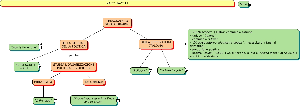 Questa Cmap, creata con IHMC CmapTools, contiene informazioni relative a: Macchiavelli Jessica Vanoni, "Il Principe" dedicato a Lorenzo de' Medici, "Ghiribizzi" rapporto azione individuale e realtà oggettiva, "Il Principe" ???? 1513, "Belfagor arcidiavolo" ("Il demone che prese moglie") novella, donne = inferno, "Discorsi sopra la prima Deca di Tito Livio" 3 libri, "Discorsi sopra la prima Deca di Tito Livio" 1513-1519, DELLA LETTERATURA ITALIANA ???? - "Le Maschere" (1504): commedia satirica - taduce l'"Andria" - commedia "Clizia" - "Discorso intorno alla nostra lingua": necessità di rifarsi al fiorentino - produzione poetica - poema "Asino" (1526-1527): terzine, si rifà all'"Asino d'oro" di Apuleio e ai miti di iniziazione, per fortuna (VI cap) ???? il principe deve agire con virtù, proprie le ha il principe savio, in volgare fiorentino riproduce la realtà quaotidiana, 3 libri 1° 60 capitoli: politica interna dello stato, amministrazione, leggi, importanza della religione, PRINCIPATO ???? "Il Principe", "Istorie fiorentine" 1520-1525, Macchiavelli esonerato da ogni incario pubblico (collaboratore dei Medici) ???? muore nel 1527, 1525: provveditore e cancelliere dei Procuratori delle Mura 1527: sacco di Roma, personaggi Timoteo, "Il Principe" concetti fondamentali dell'opera, "La Mandragola" (erba medicinale) 1518, missioni diplomatiche all'estero e in corti italiane 1506: segretario della magistratura dei Nove ufficiali dell'ordinanza e della milizia fiorentina