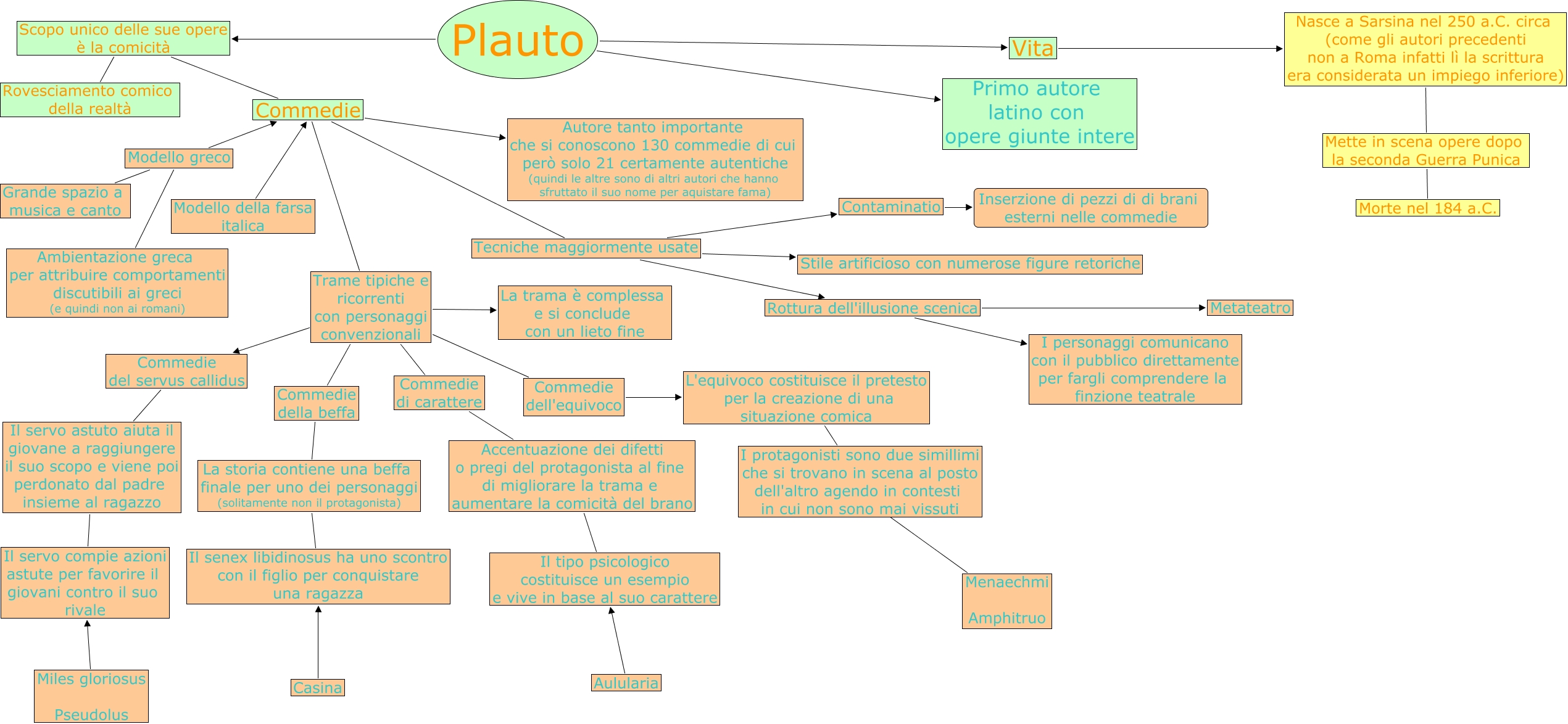 Questa Cmap, creata con IHMC CmapTools, contiene informazioni relative a: Plauto-Matteo Cornelli, Trame tipiche e ricorrenti con personaggi convenzionali Commedie dell'equivoco, Tecniche maggiormente usate Contaminatio, Trame tipiche e ricorrenti con personaggi convenzionali Commedie della beffa, Commedie del servus callidus Il servo astuto aiuta il giovane a raggiungere il suo scopo e viene poi perdonato dal padre insieme al ragazzo, Modello della farsa italica Commedie, Plauto Vita, Modello greco Commedie, Aulularia Il tipo psicologico costituisce un esempio e vive in base al suo carattere, Commedie di carattere Accentuazione dei difetti o pregi del protagonista al fine di migliorare la trama e aumentare la comicità del brano, Il servo astuto aiuta il giovane a raggiungere il suo scopo e viene poi perdonato dal padre insieme al ragazzo Il servo compie azioni astute per favorire il giovani contro il suo rivale, Vita Nasce a Sarsina nel 250 a.C. circa (come gli autori precedenti non a Roma infatti lì la scrittura era considerata un impiego inferiore), Nasce a Sarsina nel 250 a.C. circa (come gli autori precedenti non a Roma infatti lì la scrittura era considerata un impiego inferiore) Mette in scena opere dopo la seconda Guerra Punica, Mette in scena opere dopo la seconda Guerra Punica Morte nel 184 a.C., Commedie Autore tanto importante che si conoscono 130 commedie di cui però solo 21 certamente autentiche (quindi le altre sono di altri autori che hanno sfruttato il suo nome per aquistare fama), La storia contiene una beffa finale per uno dei personaggi (solitamente non il protagonista) Il senex libidinosus ha uno scontro con il figlio per conquistare una ragazza, Tecniche maggiormente usate Stile artificioso con numerose figure retoriche, Trame tipiche e ricorrenti con personaggi convenzionali Commedie del servus callidus, Modello greco Ambientazione greca per attribuire comportamenti discutibili ai greci (e quindi non ai romani), Plauto Scopo unico delle sue opere è la comicità, Modello greco Grande spazio a musica e canto