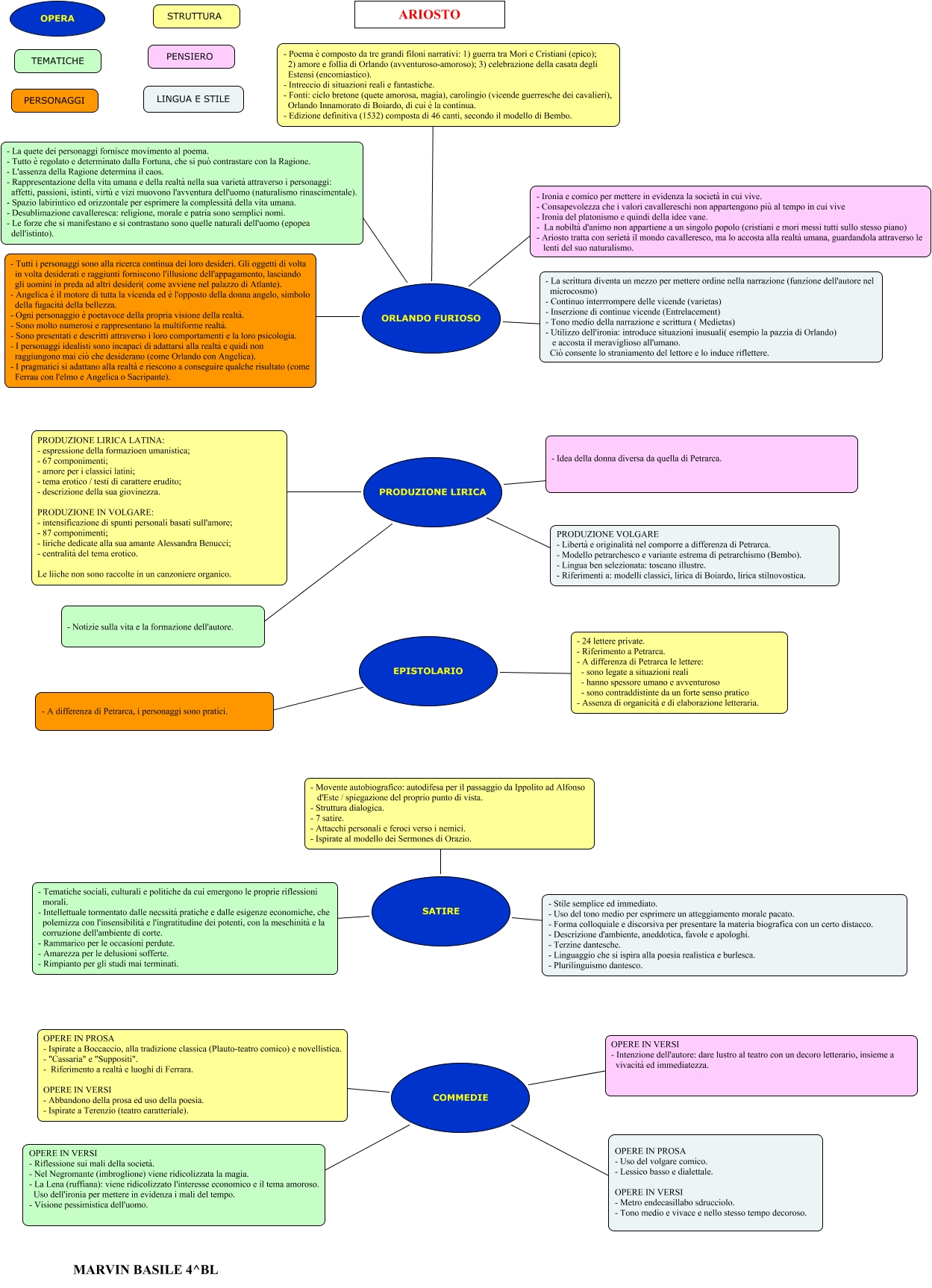 Questa Cmap, creata con IHMC CmapTools, contiene informazioni relative a: Ariosto_Marvin Basile, ORLANDO FURIOSO ???? - Tutti i personaggi sono alla ricerca continua dei loro desideri. Gli oggetti di volta in volta desiderati e raggiunti forniscono l'illusione dell'appagamento, lasciando gli uomini in preda ad altri desideri( come avviene nel palazzo di Atlante). - Angelica è il motore di tutta la vicenda ed è l'opposto della donna angelo, simbolo della fugacità della bellezza. - Ogni personaggio è poetavoce della propria visione della realtà. - Sono molto numerosi e rappresentano la multiforme realtà. - Sono presentati e descritti attraverso i loro comportamenti e la loro psicologia. - I personaggi idealisti sono incapaci di adattarsi alla realtà e quidi non raggiungono mai ciò che desiderano (come Orlando con Angelica). - I pragmatici si adattano alla realtà e riescono a conseguire qualche risultato (come Ferrau con l'elmo e Angelica o Sacripante)., EPISTOLARIO ???? - 24 lettere private. - Riferimento a Petrarca. - A differenza di Petrarca le lettere: - sono legate a situazioni reali - hanno spessore umano e avventuroso - sono contraddistinte da un forte senso pratico - Assenza di organicità e di elaborazione letteraria., ORLANDO FURIOSO ???? - La scrittura diventa un mezzo per mettere ordine nella narrazione (funzione dell'autore nel microcosmo) - Continuo interrrompere delle vicende (varietas) - Inserzione di continue vicende (Entrelacement) - Tono medio della narrazione e scrittura ( Medietas) - Utilizzo dell'ironia: introduce situazioni inusuali( esempio la pazzia di Orlando) e accosta il meraviglioso all'umano. Ciò consente lo straniamento del lettore e lo induce riflettere., ORLANDO FURIOSO ???? - Ironia e comico per mettere in evidenza la società in cui vive. - Consapevolezza che i valori cavallereschi non appartengono più al tempo in cui vive - Ironia del platonismo e quindi della idee vane. - La nobiltà d'animo non appartiene a un singolo popolo (cristiani e mori messi tutti sullo stesso piano) - Ariosto tratta con serietà il mondo cavalleresco, ma lo accosta alla realtà umana, guardandola attraverso le lenti del suo naturalismo., PRODUZIONE LIRICA ???? - Idea della donna diversa da quella di Petrarca., ORLANDO FURIOSO ???? - La quete dei personaggi fornisce movimento al poema. - Tutto è regolato e determinato dalla Fortuna, che si può contrastare con la Ragione. - L'assenza della Ragione determina il caos. - Rappresentazione della vita umana e della realtà nella sua varietà attraverso i personaggi: affetti, passioni, istinti, virtù e vizi muovono l'avventura dell'uomo (naturalismo rinascimentale). - Spazio labirintico ed orizzontale per esprimere la complessità della vita umana. - Desublimazione cavalleresca: religione, morale e patria sono semplici nomi. - Le forze che si manifestano e si contrastano sono quelle naturali dell'uomo (epopea dell'istinto)., COMMEDIE ???? OPERE IN VERSI - Intenzione dell'autore: dare lustro al teatro con un decoro letterario, insieme a vivacità ed immediatezza., EPISTOLARIO ???? - A differenza di Petrarca, i personaggi sono pratici., COMMEDIE ???? OPERE IN PROSA - Ispirate a Boccaccio, alla tradizione classica (Plauto-teatro comico) e novellistica. - "Cassaria" e "Suppositi". - Riferimento a realtà e luoghi di Ferrara. OPERE IN VERSI - Abbandono della prosa ed uso della poesia. - Ispirate a Terenzio (teatro caratteriale)., COMMEDIE ???? OPERE IN VERSI - Riflessione sui mali della società. - Nel Negromante (imbroglione) viene ridicolizzata la magia. - La Lena (ruffiana): viene ridicolizzato l'interesse economico e il tema amoroso. Uso dell'ironia per mettere in evidenza i mali del tempo. - Visione pessimistica dell'uomo., PRODUZIONE LIRICA ???? - Notizie sulla vita e la formazione dell'autore., PRODUZIONE LIRICA ???? PRODUZIONE VOLGARE - Libertà e originalità nel comporre a differenza di Petrarca. - Modello petrarchesco e variante estrema di petrarchismo (Bembo). - Lingua ben selezionata: toscano illustre. - Riferimenti a: modelli classici, lirica di Boiardo, lirica stilnovostica., PRODUZIONE LIRICA ???? - Idea della donna diversa da quella di Petrarca., SATIRE ???? - Movente autobiografico: autodifesa per il passaggio da Ippolito ad Alfonso d'Este / spiegazione del proprio punto di vista. - Struttura dialogica. - 7 satire. - Attacchi personali e feroci verso i nemici. - Ispirate al modello dei Sermones di Orazio., COMMEDIE ???? OPERE IN PROSA - Uso del volgare comico. - Lessico basso e dialettale. OPERE IN VERSI - Metro endecasillabo sdrucciolo. - Tono medio e vivace e nello stesso tempo decoroso., SATIRE ???? - Tematiche sociali, culturali e politiche da cui emergono le proprie riflessioni morali. - Intellettuale tormentato dalle necssità pratiche e dalle esigenze economiche, che polemizza con l'insensibilità e l'ingratitudine dei potenti, con la meschinità e la corruzione dell'ambiente di corte. - Rammarico per le occasioni perdute. - Amarezza per le delusioni sofferte. - Rimpianto per gli studi mai terminati., ORLANDO FURIOSO ???? - Poema è composto da tre grandi filoni narrativi: 1) guerra tra Mori e Cristiani (epico); 2) amore e follia di Orlando (avventuroso-amoroso); 3) celebrazione della casata degli Estensi (encomiastico). - Intreccio di situazioni reali e fantastiche. - Fonti: ciclo bretone (quete amorosa, magia), carolingio (vicende guerresche dei cavalieri), Orlando Innamorato di Boiardo, di cui è la continua. - Edizione definitiva (1532) composta di 46 canti, secondo il modello di Bembo., SATIRE ???? - Stile semplice ed immediato. - Uso del tono medio per esprimere un atteggiamento morale pacato. - Forma colloquiale e discorsiva per presentare la materia biografica con un certo distacco. - Descrizione d'ambiente, aneddotica, favole e apologhi. - Terzine dantesche. - Linguaggio che si ispira alla poesia realistica e burlesca. - Plurilinguismo dantesco., PRODUZIONE LIRICA ???? PRODUZIONE LIRICA LATINA: 