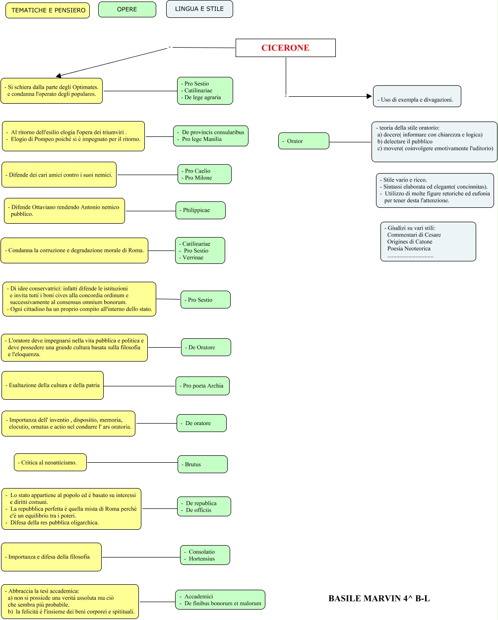 Questa Cmap, creata con IHMC CmapTools, contiene informazioni relative a: Cicerone_Marvin Basile, - Difende dei cari amici contro i suoi nemici. ???? - Pro Caelio - Pro Milone, - Pro Sestio ???? - Di idee conservatrici: infatti difende le istituzioni e invita tutti i boni cives alla concordia ordinum e successivamente al consensus omnium bonorum. - Ogni cittadino ha un proprio compito all'interno dello stato., - Importanza dell' inventio , dispositio, memoria, elocutio, ornatus e actio nel condurre l' ars oratoria. ???? - De oratore, - De Oratore ???? - L'oratore deve impegnarsi nella vita pubblica e politica e deve possedere una grande cultura basata sulla filosofia e l'eloquenza., - Importanza e difesa della filosofia ???? - Consolatio - Hortensius, - Pro poeta Archia ???? - Esaltazione della cultura e della patria, - Difende Ottaviano rendendo Antonio nemico pubblico. ???? - Philippicae, CICERONE . - Uso di exempla e divagazioni., - Critica al neoatticismo. ???? - Brutus, CICERONE . - Si schiera dalla parte degli Optimates. e condanna l'operato degli populares., - Al ritorno dell'esilio elogia l'opera dei triumviri . - Elogio di Pompeo poichè si è impegnato per il ritorno. ???? - De provincis consularibus - Pro lege Manilia, - Si schiera dalla parte degli Optimates. e condanna l'operato degli populares. ???? - Pro Sestio - Catilinariae - De lege agraria, - Abbraccia la tesi accademica: a) non si possiede una verità assoluta ma ciò che sembra più probabile. b) la felicità è l'insieme dei beni corporei e spitituali. ???? - Accademici - De finibus bonorum et malorum, - Catilinariae - Pro Sestio - Verrinae ???? - Condanna la corruzione e degradazione morale di Roma., - teoria della stile oratorio: a) docere( informare con chiarezza e logica) b) delectare il pubblico c) movere( coinvolgere emotivamente l'uditorio) ???? - Orator, - Lo stato appartiene al popolo ed è basato su interessi e diritti comuni. - La repubblica perfetta è quella mista di Roma perchè c'è un equilibrio tra i poteri. - Difesa della res pubblica oligarchica. ???? - De republica - De officiis