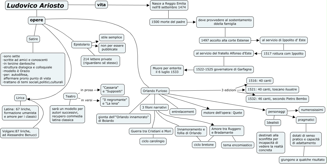 Questa Cmap, creata con IHMC CmapTools, contiene informazioni relative a: Ariosto-Mattia Guarneri, Amore tra Ruggero e Bradamante ???? ciclo bretone, Teatro in versi "Il negromante" e "La lena", opere ???? Epistolario, Epistolario ???? 214 lettere private (riguardano sé stesso), opere ???? Satire, Orlando Furioso ???? 3 filoni narrativi, Teatro in prosa "Cassaria" e "Suppositi", Ludovico Ariosto vita Nasce a Reggio Emilia nell'8 settembre 1474, opere ???? Orlando Furioso, personaggi ???? pragmatici, Orlando Furioso 3 edizioni 1532: 46 canti, secondo Pietro Bembo, 3 filoni narrativi ???? Innamoramento e follia di Orlando, 1497 accolto alla corte Estense ???? al servizio di Ippolito d' Este, Orlando Furioso 3 edizioni 1521: 40 canti, toscano iluustre, Lirica ???? Volgare:87 liriche, ad Alessandre Benucci, Teatro ???? sarà un modello per autori successivi, recupero commedia latina classica, Innamoramento e follia di Orlando ???? ciclo bretone, al servizio del fratello Alfonso d'Este ???? 1522-1525 governatore di Garfagna, Guerra tra Cristiani e Mori ???? ciclo carolingio, personaggi ???? Idealisti