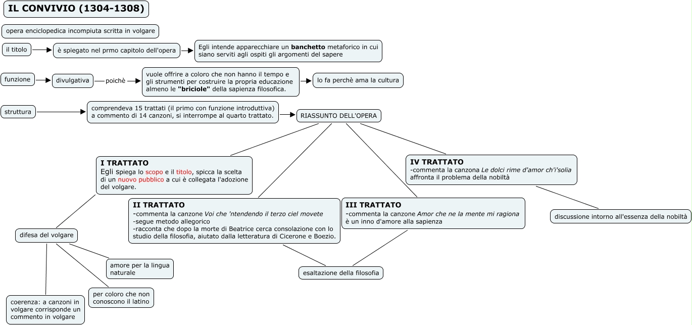 Questa Cmap, creata con IHMC CmapTools, contiene informazioni relative a: Il convivio Dante - Rossini Paola, funzione divulgativa, RIASSUNTO DELL'OPERA IV TRATTATO -commenta la canzona Le dolci rime d'amor ch'i'solia affronta il problema della nobiltà, II TRATTATO -commenta la canzone Voi che 'ntendendo il terzo ciel movete -segue metodo allegorico -racconta che dopo la morte di Beatrice cerca consolazione con lo studio della filosofia, aiutato dalla letteratura di Cicerone e Boezio. esaltazione della filosofia, comprendeva 15 trattati (il primo con funzione introduttiva) a commento di 14 canzoni, si interrompe al quarto trattato. RIASSUNTO DELL'OPERA, divulgativa poichè vuole offrire a coloro che non hanno il tempo e gli strumenti per costruire la propria educazione almeno le "briciole" della sapienza filosofica., III TRATTATO -commenta la canzone Amor che ne la mente mi ragiona è un inno d'amore alla sapienza esaltazione della filosofia, vuole offrire a coloro che non hanno il tempo e gli strumenti per costruire la propria educazione almeno le "briciole" della sapienza filosofica. lo fa perchè ama la cultura, RIASSUNTO DELL'OPERA I TRATTATO Egli spiega lo scopo e il titolo, spicca la scelta di un nuovo pubblico a cui è collegata l'adozione del volgare., I TRATTATO Egli spiega lo scopo e il titolo, spicca la scelta di un nuovo pubblico a cui è collegata l'adozione del volgare. difesa del volgare, IV TRATTATO -commenta la canzona Le dolci rime d'amor ch'i'solia affronta il problema della nobiltà discussione intorno all'essenza della nobiltà, RIASSUNTO DELL'OPERA II TRATTATO -commenta la canzone Voi che 'ntendendo il terzo ciel movete -segue metodo allegorico -racconta che dopo la morte di Beatrice cerca consolazione con lo studio della filosofia, aiutato dalla letteratura di Cicerone e Boezio., difesa del volgare amore per la lingua naturale, RIASSUNTO DELL'OPERA III TRATTATO -commenta la canzone Amor che ne la mente mi ragiona è un inno d'amore alla sapienza, è spiegato nel prmo capitolo dell'opera Egli intende apparecchiare un banchetto metaforico in cui siano serviti agli ospiti gli argomenti del sapere, struttura comprendeva 15 trattati (il primo con funzione introduttiva) a commento di 14 canzoni, si interrompe al quarto trattato., il titolo è spiegato nel prmo capitolo dell'opera, difesa del volgare coerenza: a canzoni in volgare corrisponde un commento in volgare, difesa del volgare per coloro che non conoscono il latino