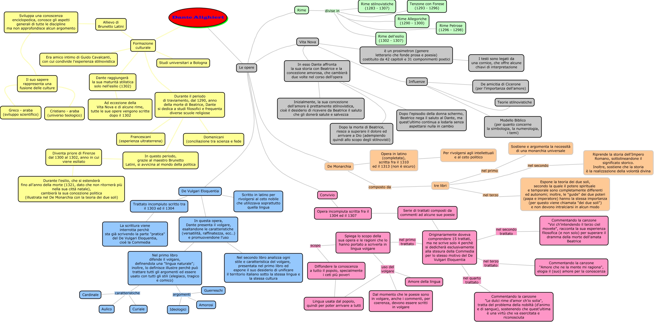 Questa Cmap, creata con IHMC CmapTools, contiene informazioni relative a: Dante - Mirko Fustinoni, Sviluppa una conoscenza enciclopedica, conosce gli aspetti generali di tutte le discipline ma non approfondisce alcun argomento Il suo sapere rappresenta una fusione delle culture, Le opere Vita Nova, In esso Dante affronta la sua storia con Beatrice e la concezione amorosa, che cambierà due volte nel corso dell'opera Dopo l'episodio della donna schermo, Beatrice nega il saluto al Dante, ma quest'ultimo continua a lodarla senza aspettarsi nulla in cambio, Originariamente doveva comprendere 15 trattati, ma ne scrive solo 4 perchè si dedicherà esclusivamente alla stesura della Commedia per lo stesso motivo del De Vulgari Eloquentia nel quarto trattato Commentando la canzone "Le dulci rime d'amor ch'io solia", tratta del problema della nobiltà (d'animo e di sangue), sostenendo che quest'ultima è una virtù che va esercitata e riconosciuta, Spiega lo scopo della sua opera e le ragioni che lo hanno portato a scriverla in lingua volgare uso del volgare Amore della lingua, Formazione culturale Allievo di Brunetto Latini, Dante raggiungerà la sua maturità stilistica solo nell'esilio (1302) Ad eccezione della Vita Nova e di alcune rime, tutte le sue opere vengono scritte dopo il 1302, Influenze Teorie stilnovistiche, In esso Dante affronta la sua storia con Beatrice e la concezione amorosa, che cambierà due volte nel corso dell'opera Inizialmente, la sua concezione dell'amore è prettamente stilnovistica, cioè il desiderio di ricevere da Beatrice il saluto che gli donerà salute e salvezza, Spiega lo scopo della sua opera e le ragioni che lo hanno portato a scriverla in lingua volgare scopo Diffondere la conoscenza a tutto il popolo, specialmente i ceti più poveri, Formazione culturale Durante il periodo di traviamento, dal 1290, anno della morte di Beatrice, Dante si dedica a studi filosofici e frequenta diverse scuole religiose, Originariamente doveva comprendere 15 trattati, ma ne scrive solo 4 perchè si dedicherà esclusivamente alla stesura della Commedia per lo stesso motivo del De Vulgari Eloquentia nel terzo trattato Commentando la canzone "Amore che ne la mente mi ragiona", elogia il (suo) amore per la conoscenza, Le opere Convivio, Convivio Opera incompiuta scritta fra il 1304 ed il 1307, tre libri nel secondo Riprende la storia dell'Impero Romano, sottolineandone il significato storico. Inoltre, sostiene che la storia è la realizzazione della volontà divina, Le opere Rime, Rime divise in Rime Allegoriche (1290 - 1300), Spiega lo scopo della sua opera e le ragioni che lo hanno portato a scriverla in lingua volgare uso del volgare Dal momento che le poesie sono in volgare, anche i commenti, per coerenza, devono essere scritti in volgare, Il suo sapere rappresenta una fusione delle culture Cristiano - araba (universo teologico), Nel primo libro difende il volgare, definendola una "lingua naturale"; inoltre, lo definisce illustre perchè può trattare tutti gli argomenti ed essere usato con tutti gli stili (elegiaco, tragico e comico) argomenti Ideologici