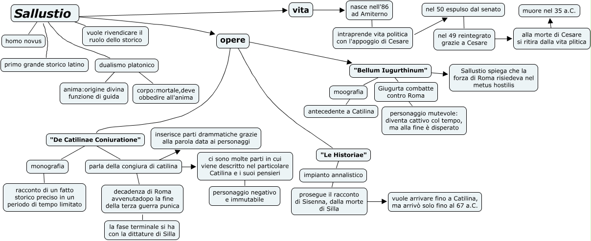 Questa Cmap, creata con IHMC CmapTools, contiene informazioni relative a: Sallustio-Mattia Guarneri, "Le Historiae" ???? impianto annalistico, Sallustio ???? dualismo platonico, opere ???? "Le Historiae", opere ???? "Bellum Iugurthinum", "De Catilinae Coniuratione" ???? monografia, parla della congiura di catilina ???? ci sono molte parti in cui viene descritto nel particolare Catilina e i suoi pensieri, vita ???? nasce nell'86 ad Amiterno, Sallustio ???? vita, intraprende vita politica con l'appoggio di Cesare ???? nel 50 espulso dal senato, moografia ???? antecedente a Catilina, Sallustio ???? primo grande storico latino, ci sono molte parti in cui viene descritto nel particolare Catilina e i suoi pensieri ???? personaggio negativo e immutabile, "Bellum Iugurthinum" ???? Giugurta combatte contro Roma, "De Catilinae Coniuratione" ???? parla della congiura di catilina, prosegue il racconto di Sisenna, dalla morte di Silla ???? vuole arrivare fino a Catilina, ma arrivò solo fino al 67 a.C., nel 49 reintegrato grazie a Cesare ???? alla morte di Cesare si ritira dalla vita plitica, parla della congiura di catilina ???? inserisce parti drammatiche grazie alla parola data ai personaggi, Sallustio ???? vuole rivendicare il ruolo dello storico, monografia ???? racconto di un fatto storico preciso in un periodo di tempo limitato, nasce nell'86 ad Amiterno ???? intraprende vita politica con l'appoggio di Cesare
