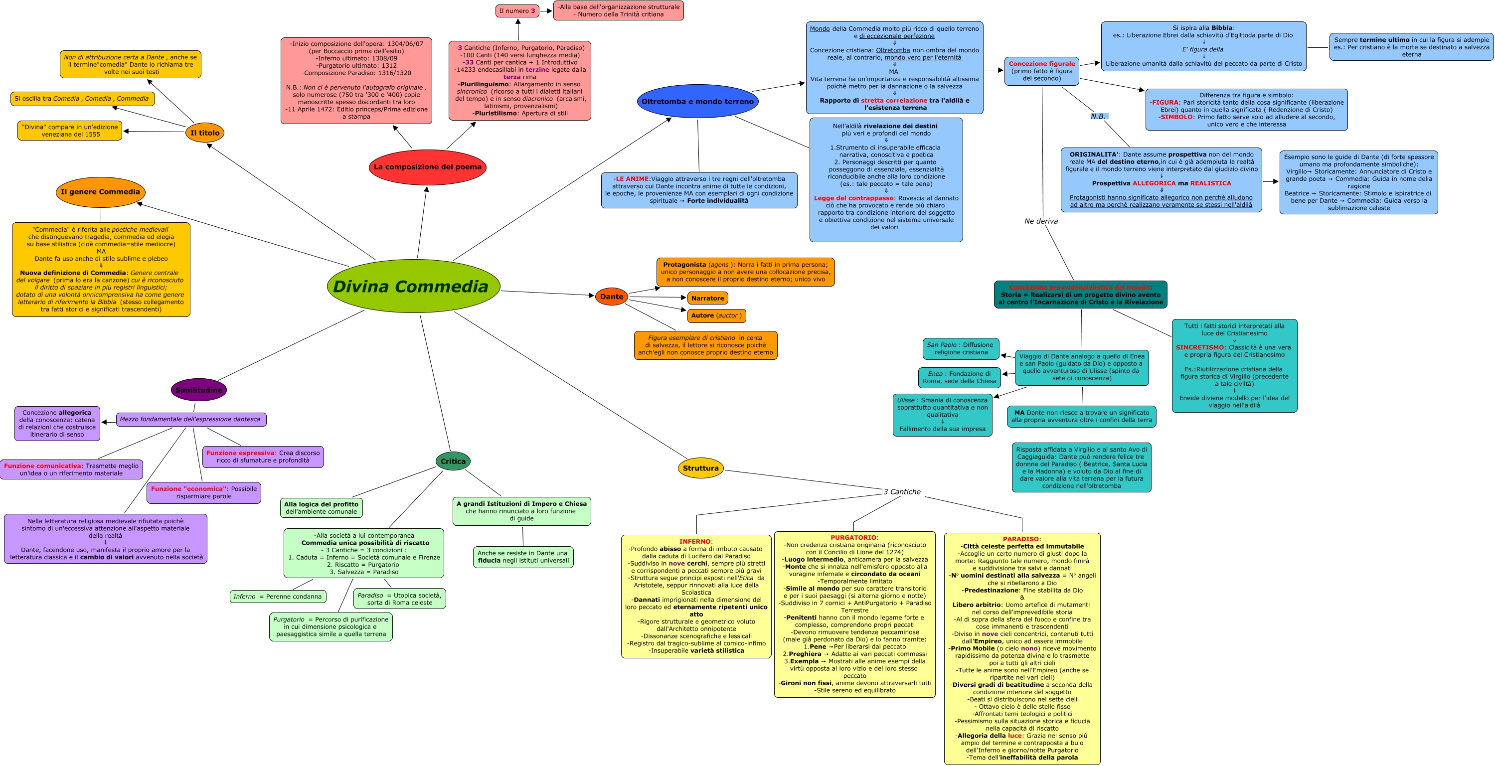 Questa Cmap, creata con IHMC CmapTools, contiene informazioni relative a: Divina Commedia - Elia Balestra, Divina Commedia Dante, Divina Commedia Oltretomba e mondo terreno, Dante Figura esemplare di cristiano in cerca di salvezza, il lettore si riconosce poichè anch'egli non conosce proprio destino eterno, La composizione del poema -3 Cantiche (Inferno, Purgatorio, Paradiso) -100 Canti (140 versi lunghezza media) -33 Canti per cantica + 1 Introduttivo -14233 endecasillabi in terzine legate dalla terza rima -Plurilinguismo: Allargamento in senso sincronico (ricorso a tutti i dialetti italiani del tempo) e in senso diacronico (arcaismi, latinismi, provenzalismi) -Pluristilismo: Apertura di stili, Viaggio di Dante analogo a quello di Enea e san Paolo (guidato da Dio) e opposto a quello avventuroso di Ulisse (spinto da sete di conoscenza) MA Dante non riesce a trovare un significato alla propria avventura oltre i confini della terra, Il numero 3 -Alla base dell'organizzazione strutturale - Numero della Trinità critiana, ORIGINALITA': Dante assume prospettiva non del mondo reale MA del destino eterno,in cui è già adempiuta la realtà figurale e il mondo terreno viene interpretato dal giudizio divino ↓ Prospettiva ALLEGORICA ma REALISTICA ⇓ Protagonisti hanno significato allegorico non perchè alludono ad altro ma perchè realizzano veramente se stessi nell'aldilà Esempio sono le guide di Dante (di forte spessore umano ma profondamente simboliche): Virgilio→ Storicamente: Annunciatore di Cristo e grande poeta → Commedia: Guida in nome della ragione Beatrice → Storicamente: Stimolo e ispiratrice di bene per Dante → Commedia: Guida verso la sublimazione celeste, Concezione provvidenzialistica del mondo: Storia = Realizarsi di un progetto divino avente al centro l'Incarnazione di Cristo e la Rivelazione Viaggio di Dante analogo a quello di Enea e san Paolo (guidato da Dio) e opposto a quello avventuroso di Ulisse (spinto da sete di conoscenza), Divina Commedia Similitudine, Struttura 3 Cantiche PARADISO: -Città celeste perfetta ed immutabile -Accoglie un certo numero di giusti dopo la morte: Raggiunto tale numero, mondo finirà e suddivisione tra salvi e dannati -N° uomini destinati alla salvezza = N° angeli che si ribellarono a Dio -Predestinazione: Fine stabilita da Dio & Libero arbitrio: Uomo artefice di mutamenti nel corso dell'imprevedibile storia -Al di sopra della sfera del fuoco e confine tra cose immanenti e trascendenti -Diviso in nove cieli concentrici, contenuti tutti dall'Empireo, unico ad essere immobile -Primo Mobile (o cielo nono) riceve movimento rapidissimo da potenza divina e lo trasmette poi a tutti gli altri cieli -Tutte le anime sono nell'Empireo (anche se ripartite nei vari cieli) -Diversi gradi di beatitudine a seconda della condizione interiore del soggetto -Beati si distribuiscono nei sette cieli - Ottavo cielo è delle stelle fisse -Affrontati temi teologici e politici -Pessimismo sulla situazione storica e fiducia nella capacità di riscatto -Allegoria della luce: Grazia nel senso più ampio del termine e contrapposta a buio dell'Inferno e giorno/notte Purgatorio -Tema dell'ineffabilità della parola, Oltretomba e mondo terreno Nell'aldilà rivelazione dei destini più veri e profondi del mondo ⇓ 1.Strumento di insuperabile efficacia narrativa, conoscitiva e poetica 2. Personaggi descritti per quanto posseggono di essenziale, essenzialità riconducibile anche alla loro condizione (es.: tale peccato = tale pena) ⇓ Legge del contrappasso: Rovescia al dannato ciò che ha provocato e rende più chiaro rapporto tra condizione interiore del soggetto e obiettiva condizione nel sistema universale dei valori, -Alla società a lui contemporanea -Commedia unica possibilità di riscatto - 3 Cantiche = 3 condizioni : 1. Caduta = Inferno = Società comunale e Firenze 2. Riscatto = Purgatorio 3. Salvezza = Paradiso Paradiso = Utopica società, sorta di Roma celeste, -3 Cantiche (Inferno, Purgatorio, Paradiso) -100 Canti (140 versi lunghezza media) -33 Canti per cantica + 1 Introduttivo -14233 endecasillabi in terzine legate dalla terza rima -Plurilinguismo: Allargamento in senso sincronico (ricorso a tutti i dialetti italiani del tempo) e in senso diacronico (arcaismi, latinismi, provenzalismi) -Pluristilismo: Apertura di stili Il numero 3, Mondo della Commedia molto più ricco di quello terreno e di eccezionale perfezione ⇓ Concezione cristiana: Oltretomba non ombra del mondo reale, al contrario, mondo vero per l'eternità ⇓ MA Vita terrena ha un'importanza e responsabilità altissima poichè metro per la dannazione o la salvezza ⇓ Rapporto di stretta correlazione tra l'aldilà e l'esistenza terrena Concezione figurale (primo fatto è figura del secondo), Dante Protagonista (agens): Narra i fatti in prima persona; unico personaggio a non avere una collocazione precisa, a non conoscere il proprio destino eterno; unico vivo, Divina Commedia Critica, Oltretomba e mondo terreno -LE ANIME:Viaggio attraverso i tre regni dell'oltretomba attraverso cui Dante incontra anime di tutte le condizioni, le epoche, le provenienze MA con esemplari di ogni condizione spirituale → Forte individualità, Struttura 3 Cantiche INFERNO: -Profondo abisso a forma di imbuto causato dalla caduta di Lucifero dal Paradiso -Suddiviso in nove cerchi, sempre più stretti e corrispondenti a peccati sempre più gravi -Struttura segue principi esposti nell'Etica da Aristotele, seppur rinnovati alla luce della Scolastica -Dannati imprigionati nella dimensione del loro peccato ed eternamente ripetenti unico atto -Rigore strutturale e geometrico voluto dall'Architetto onnipotente -Dissonanze scenografiche e lessicali -Registro dal tragico-sublime al comico-infimo -Insuperabile varietà stilistica, Dante Narratore, MA Dante non riesce a trovare un significato alla propria avventura oltre i confini della terra Risposta affidata a Virgilio e al santo Avo di Caggiaguida: Dante può rendere fe