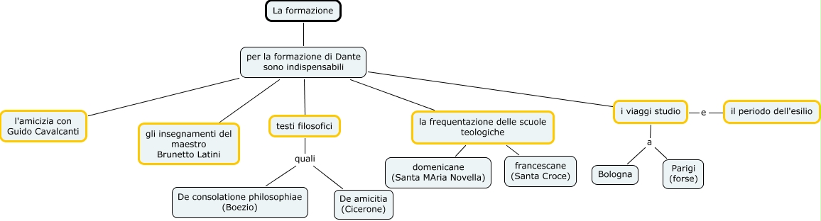 Questa Cmap, creata con IHMC CmapTools, contiene informazioni relative a: La formazione di Dante- Miriana, per la formazione di Dante sono indispensabili la frequentazione delle scuole teologiche, i viaggi studio a Bologna, per la formazione di Dante sono indispensabili l'amicizia con Guido Cavalcanti, i viaggi studio a Parigi (forse), per la formazione di Dante sono indispensabili i viaggi studio, i viaggi studio e il periodo dell'esilio, la frequentazione delle scuole teologiche domenicane (Santa MAria Novella), La formazione per la formazione di Dante sono indispensabili, per la formazione di Dante sono indispensabili gli insegnamenti del maestro Brunetto Latini, per la formazione di Dante sono indispensabili testi filosofici, testi filosofici quali De consolatione philosophiae (Boezio), la frequentazione delle scuole teologiche francescane (Santa Croce), testi filosofici quali De amicitia (Cicerone)