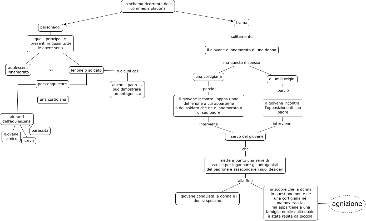 Questa Cmap, creata con IHMC CmapTools, contiene informazioni relative a: Lo schema della commedia plautina- Miriana, il giovane incontra l'opposizione di suo padre interviene il servo del giovane, aiutanti dell'adulescens parassita, il giovane incontra l'opposizione del lenone a cui appartiene o del soldato che ne è innamorato o di suo padre interviene il servo del giovane, trama solitamente il giovane è innamorato di una donna, quelli principali e presenti in quasi tutte le opere sono adulescens innamorato, si scopre che la donna in questione non è né una cortigiana né una poveraccia, ma appartiene a una famiglia nobile dalla quale è stata rapita da piccola agnizione, il giovane è innamorato di una donna ma questa è spesso una cortigiana, adulescens innamorato aiutanti dell'adulescens, Lo schema ricorrente della commedia plautina trama, il servo del giovane che mette a punto una serie di astuzie per ingannare gli antagonisti del padrone e assecondare i suoi desideri, il giovane è innamorato di una donna ma questa è spesso di umili origini, personaggi quelli principali e presenti in quasi tutte le opere sono, mette a punto una serie di astuzie per ingannare gli antagonisti del padrone e assecondare i suoi desideri alla fine si scopre che la donna in questione non è né una cortigiana né una poveraccia, ma appartiene a una famiglia nobile dalla quale è stata rapita da piccola, di umili origini perciò il giovane incontra l'opposizione di suo padre, mette a punto una serie di astuzie per ingannare gli antagonisti del padrone e assecondare i suoi desideri alla fine il giovane conquista la donna e i due si sposano, lenone o soldato per conquistare, aiutanti dell'adulescens giovane amico, Lo schema ricorrente della commedia plautina personaggi, quelli principali e presenti in quasi tutte le opere sono lenone o soldato, aiutanti dell'adulescens servo