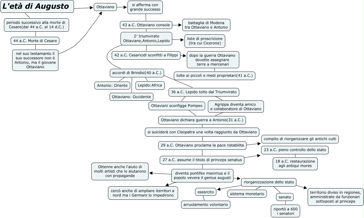 Questa Cmap, creata con IHMC CmapTools, contiene informazioni relative a: Augusto-Mattia Guarneri, diventa pontifex maximus e il popolo vevera il genius augusti ???? Ottenne anche l'aiuto di molti artisti che lo aiutarono con propagande, diventa pontifex maximus e il popolo vevera il genius augusti ???? cercò anche di ampliare iterritori a nord ma i Germani lo impedirono, 44 a.C. Morte di Cesare ???? nel suo testamanto il suo successore non è Antonio, ma il giovane Ottaviano, esesrcito ???? arruolamento volontario, 2° triumvirato Ottaviano,Antonio,Lepido ???? liste di proscrizione (tra cui Cicerone), 42 a.C. Cesaricidi sconfitti a Filippi ???? dopo la guerra Ottaviano dovette assegnare terre a mercenari, L'età di Augusto ???? Ottaviano, 43 a.C. Ottaviano console ???? 2° triumvirato Ottaviano,Antonio,Lepido, 23 a.C. pieno controllo dello stato ???? 18 a.C. restaurazione agli antiqui mores, si suiciderà con Cleopatra una volta raggiunto da Ottaviano ???? 29 a.C. Ottaviano proclama la pace ristabilita, L'età di Augusto ???? periodo successivo alla morte di Cesare(dal 44 a.C. al 14 d.C.), 2° triumvirato Ottaviano,Antonio,Lepido ???? 42 a.C. Cesaricidi sconfitti a Filippi, 29 a.C. Ottaviano proclama la pace ristabilita ???? 27 a.C. assume il titolo di princeps senatus, riorganizzazione dello stato ???? esesrcito, 43 a.C. Ottaviano console ???? battaglia di Modena tra Ottaviano e Antonio, riorganizzazione dello stato ???? senato, senato ???? riportò a 600 i senatori, Ottaviano ???? si afferma con grande successo, accordi di Brindisi(40 a.C.) ???? Ottaviano: Occidente, accordi di Brindisi(40 a.C.) ???? 36 a.C. Lepido tolto dal Triumvirato