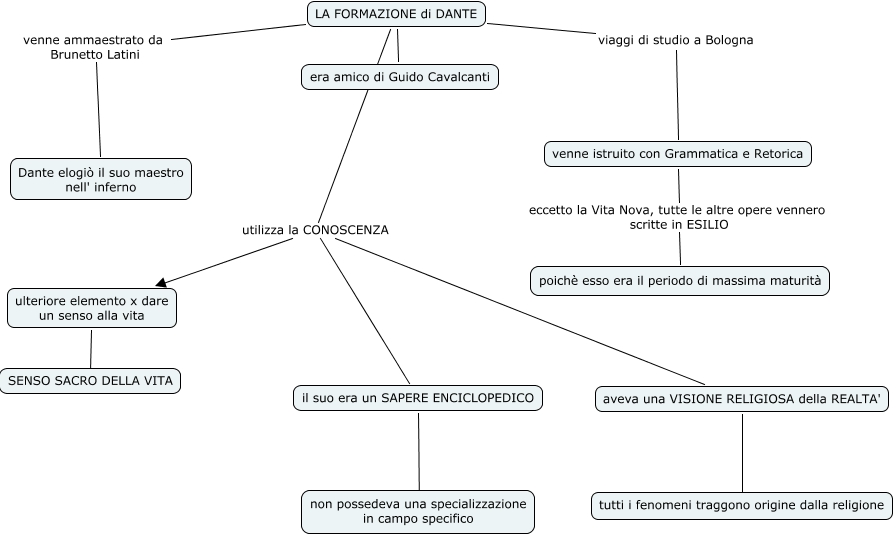 Questa Cmap, creata con IHMC CmapTools, contiene informazioni relative a: LaFormazioneDiDante-PaolaG, ulteriore elemento x dare un senso alla vita ???? SENSO SACRO DELLA VITA, aveva una VISIONE RELIGIOSA della REALTA' ???? tutti i fenomeni traggono origine dalla religione, LA FORMAZIONE di DANTE viaggi di studio a Bologna venne istruito con Grammatica e Retorica, LA FORMAZIONE di DANTE utilizza la CONOSCENZA il suo era un SAPERE ENCICLOPEDICO, LA FORMAZIONE di DANTE ???? era amico di Guido Cavalcanti, LA FORMAZIONE di DANTE utilizza la CONOSCENZA aveva una VISIONE RELIGIOSA della REALTA', venne istruito con Grammatica e Retorica eccetto la Vita Nova, tutte le altre opere vennero scritte in ESILIO poichè esso era il periodo di massima maturità, LA FORMAZIONE di DANTE utilizza la CONOSCENZA ulteriore elemento x dare un senso alla vita, il suo era un SAPERE ENCICLOPEDICO ???? non possedeva una specializzazione in campo specifico, LA FORMAZIONE di DANTE venne ammaestrato da Brunetto Latini Dante elogiò il suo maestro nell' inferno