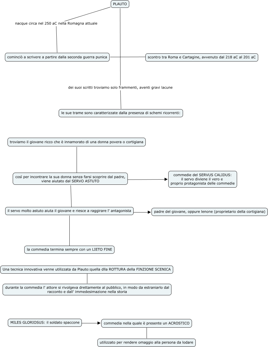 Questa Cmap, creata con IHMC CmapTools, contiene informazioni relative a: Plauto-PaolaG, il servo molto astuto aiuta il giovane e riesce a raggirare l' antagonista ???? la commedia termina sempre con un LIETO FINE, il servo molto astuto aiuta il giovane e riesce a raggirare l' antagonista ???? padre del giovane, oppure lenone (proprietario della cortigiana), MILES GLORIOSUS: il soldato spaccone ???? commedia nella quale è presente un ACROSTICO, PLAUTO nacque circa nel 250 aC nella Romagna attuale cominciò a scrivere a partire dalla seconda guerra punica, così per incontrare la sua donna senza farsi scoprire dal padre, viene aiutato dal SERVO ASTUTO ???? il servo molto astuto aiuta il giovane e riesce a raggirare l' antagonista, così per incontrare la sua donna senza farsi scoprire dal padre, viene aiutato dal SERVO ASTUTO ???? commedie del SERVUS CALIDUS: il servo diviene il vero e proprio protagonista delle commedie, PLAUTO dei suoi scritti troviamo solo frammenti, aventi gravi lacune le sue trame sono caratterizzate dalla presenza di schemi ricorrenti:, Una tecnica innovativa venne utilizzata da Plauto:quella dlla ROTTURA della FINZIONE SCENICA ???? durante la commedia l' attore si rivolgeva drettamente al pubblico, in modo da estraniarlo dal racconto e dall' immedesimazione nella storia, troviamo il giovane ricco che è innamorato di una donna povera o cortigiana ???? così per incontrare la sua donna senza farsi scoprire dal padre, viene aiutato dal SERVO ASTUTO, commedia nella quale è presente un ACROSTICO ???? utilizzato per rendere omaggio alla persona da lodare, cominciò a scrivere a partire dalla seconda guerra punica ???? scontro tra Roma e Cartagine, avvenuto dal 218 aC al 201 aC