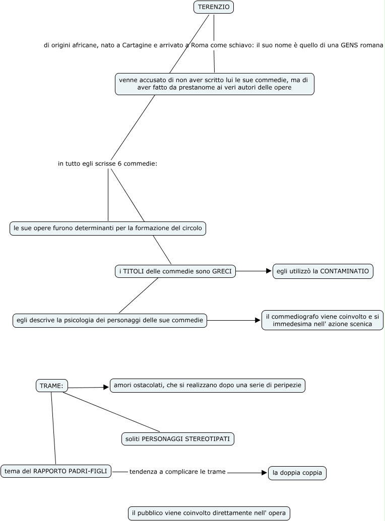 Questa Cmap, creata con IHMC CmapTools, contiene informazioni relative a: Terenzio-PaolaG, TERENZIO in tutto egli scrisse 6 commedie: le sue opere furono determinanti per la formazione del circolo, TERENZIO in tutto egli scrisse 6 commedie: i TITOLI delle commedie sono GRECI, i TITOLI delle commedie sono GRECI ???? egli utilizzò la CONTAMINATIO, TRAME: ???? soliti PERSONAGGI STEREOTIPATI, TRAME: ???? tema del RAPPORTO PADRI-FIGLI, tema del RAPPORTO PADRI-FIGLI tendenza a complicare le trame la doppia coppia, TERENZIO di origini africane, nato a Cartagine e arrivato a Roma come schiavo: il suo nome è quello di una GENS romana venne accusato di non aver scritto lui le sue commedie, ma di aver fatto da prestanome ai veri autori delle opere, TRAME: ???? amori ostacolati, che si realizzano dopo una serie di peripezie, i TITOLI delle commedie sono GRECI ???? egli descrive la psicologia dei personaggi delle sue commedie, egli descrive la psicologia dei personaggi delle sue commedie ???? il commediografo viene coinvolto e si immedesima nell' azione scenica