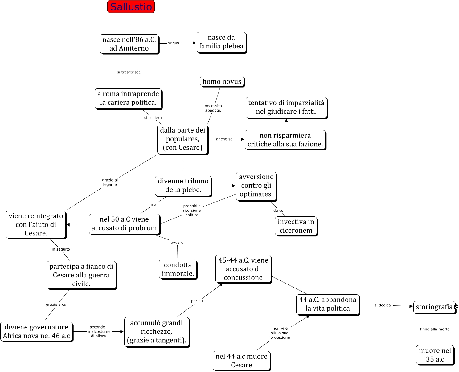 Questa Cmap, creata con IHMC CmapTools, contiene informazioni relative a: Sallustio, non vi è un fredda esposizione di fatti. differenza annales ampie descrizione dei fatti storici e ritratti psicologici dei personaggi attraverso discorsi in prima persona., sono molto diversi tra di loro, emerge in positivo per Mario. ???? simpatia di Sallustio per i populares, divenne tribuno della plebe. ma nel 50 a.C viene accusato di probrum, Catilina come è presentato? figura negativa statica ma vigorosa e potente, descritto come un eroe., similitudini con il de coniuratione catilina. ???? personaggi descritti con i ritratti psicologici., storiografia finno alla morte muore nel 35 a.c, Bellum Iugurthinum suddiviso in 114 capitoli, historiae passa dalla monografia ad un opera analistica., monografia ???? tratta un fatto ben preciso., storiografia stile variatio, si ispira a Catone e Tucidide ???? stretta osservanza mos maiorum, storiografia ha come obiettivo crecare risposte alla crisi repubblica, Bellum Iugurthinum personaggi romani sono molto diversi tra di loro, emerge in positivo per Mario., mantenere il mos maiorum quindi deve cercare di valutare i fatti storici in maniera critica e moralistica., lettere di Mitridate e temi contro l'imperialismo romano. ???? primo tentativo di vedere il punto di vista dei vinti., historiae tratta gli anni 78-67 a.C., a roma intraprende la cariera politica. si schiera dalla parte dei populares, (con Cesare), gli anni 78-67 a.C. particolare attenzione lettere di Mitridate e temi contro l'imperialismo romano., homo novus necessita appoggi. dalla parte dei populares, (con Cesare), evitare ogni scontatezza stilistica, in contraposizione con la concinnitas ciceroniana. infatti grande spazio a excursus che rompono il ritmo.