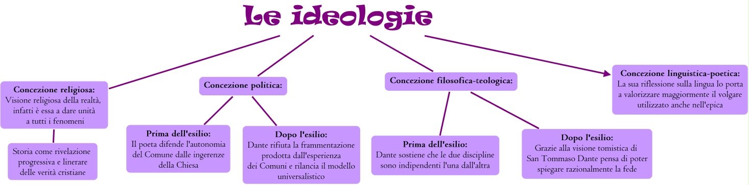Questa Cmap, creata con IHMC CmapTools, contiene informazioni relative a: Le ideologie di Dante-Veronica, Le ideologie Concezione filosofica-teologica:, Concezione filosofica-teologica: Dopo l'esilio: Grazie alla visione tomistica di San Tommaso Dante pensa di poter spiegare razionalmente la fede, Le ideologie Concezione religiosa: Visione religiosa della realtà, infatti è essa a dare unità a tutti i fenomeni, Concezione religiosa: Visione religiosa della realtà, infatti è essa a dare unità a tutti i fenomeni Storia come rivelazione progressiva e linerare delle verità cristiane, Le ideologie Concezione linguistica-poetica: La sua riflessione sulla lingua lo porta a valorizzare maggiormente il volgare utilizzato anche nell'epica, Concezione politica: Dopo l'esilio: Dante rifiuta la frammentazione prodotta dall'esperienza dei Comuni e rilancia il modello universalistico, Le ideologie Concezione politica:, Concezione filosofica-teologica: Prima dell'esilio: Dante sostiene che le due discipline sono indipendenti l'una dall'altra, Concezione politica: Prima dell'esilio: Il poeta difende l'autonomia del Comune dalle ingerenze della Chiesa