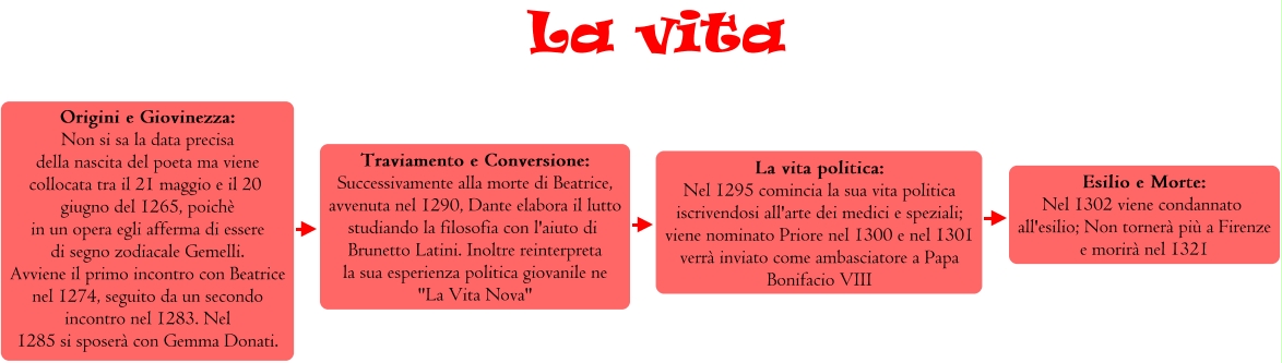 Questa Cmap, creata con IHMC CmapTools, contiene informazioni relative a: La vita di Dante-Veronica, Origini e Giovinezza: Non si sa la data precisa della nascita del poeta ma viene collocata tra il 21 maggio e il 20 giugno del 1265, poichè in un opera egli afferma di essere di segno zodiacale Gemelli. Avviene il primo incontro con Beatrice nel 1274, seguito da un secondo incontro nel 1283. Nel 1285 si sposerà con Gemma Donati. Traviamento e Conversione: Successivamente alla morte di Beatrice, avvenuta nel 1290, Dante elabora il lutto studiando la filosofia con l'aiuto di Brunetto Latini. Inoltre reinterpreta la sua esperienza politica giovanile ne ''La Vita Nova'', La vita politica: Nel 1295 comincia la sua vita politica iscrivendosi all'arte dei medici e speziali; viene nominato Priore nel 1300 e nel 1301 verrà inviato come ambasciatore a Papa Bonifacio VIII Esilio e Morte: Nel 1302 viene condannato all'esilio; Non tornerà più a Firenze e morirà nel 1321, Traviamento e Conversione: Successivamente alla morte di Beatrice, avvenuta nel 1290, Dante elabora il lutto studiando la filosofia con l'aiuto di Brunetto Latini. Inoltre reinterpreta la sua esperienza politica giovanile ne ''La Vita Nova'' La vita politica: Nel 1295 comincia la sua vita politica iscrivendosi all'arte dei medici e speziali; viene nominato Priore nel 1300 e nel 1301 verrà inviato come ambasciatore a Papa Bonifacio VIII