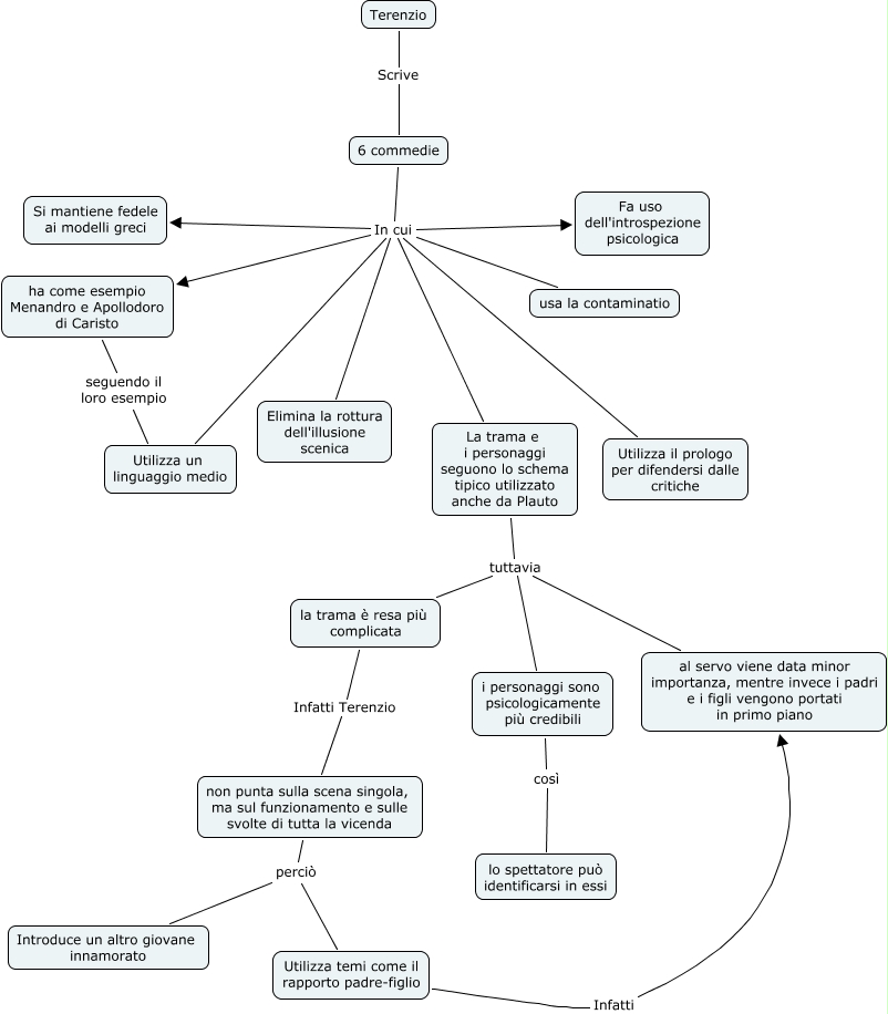 Questa Cmap, creata con IHMC CmapTools, contiene informazioni relative a: Terenzio-Midali, 6 commedie In cui Utilizza il prologo per difendersi dalle critiche, 6 commedie In cui ha come esempio Menandro e Apollodoro di Caristo, Utilizza temi come il rapporto padre-figlio Infatti al servo viene data minor importanza, mentre invece i padri e i figli vengono portati in primo piano, La trama e i personaggi seguono lo schema tipico utilizzato anche da Plauto tuttavia i personaggi sono psicologicamente più credibili, 6 commedie In cui Fa uso dell'introspezione psicologica, i personaggi sono psicologicamente più credibili così lo spettatore può identificarsi in essi, la trama è resa più complicata Infatti Terenzio non punta sulla scena singola, ma sul funzionamento e sulle svolte di tutta la vicenda, 6 commedie In cui La trama e i personaggi seguono lo schema tipico utilizzato anche da Plauto, 6 commedie In cui Si mantiene fedele ai modelli greci, non punta sulla scena singola, ma sul funzionamento e sulle svolte di tutta la vicenda perciò Utilizza temi come il rapporto padre-figlio, Terenzio Scrive 6 commedie, 6 commedie In cui usa la contaminatio, La trama e i personaggi seguono lo schema tipico utilizzato anche da Plauto tuttavia al servo viene data minor importanza, mentre invece i padri e i figli vengono portati in primo piano, ha come esempio Menandro e Apollodoro di Caristo seguendo il loro esempio Utilizza un linguaggio medio, 6 commedie In cui Elimina la rottura dell'illusione scenica, non punta sulla scena singola, ma sul funzionamento e sulle svolte di tutta la vicenda perciò Introduce un altro giovane innamorato, 6 commedie In cui Utilizza un linguaggio medio, La trama e i personaggi seguono lo schema tipico utilizzato anche da Plauto tuttavia la trama è resa più complicata