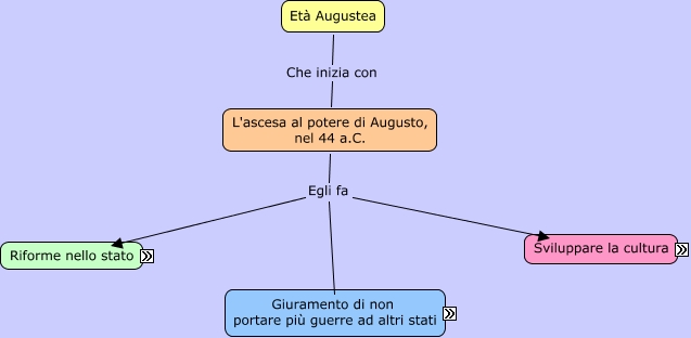 Questa Cmap, creata con IHMC CmapTools, contiene informazioni relative a: Età augustea - Francesca Capelli, Riorganizza le province dividendole in Province imperiali, Non vuole più guerre Quindi Risolve la Guerra contro i Parti in maniera diplomatica, Non vuole più guerre Quindi Con i Germani a Teutoburgo arretra, Fa riforme cioè Riporta il numero di senatori a 600, Battaglia di Azio (31 a.C.), e al suo termine Augusto si trova padrone dell'intero Impero Romano Inoltre Ottiene la Tribunicia Potestas, Fa riforme cioè Si circonda di ottimi collaboratori, che lo aiutano a amministrare lo stato, L'ascesa al potere di Augusto, nel 44 a.C. Egli fa Non vuole più guerre, L'ascesa al potere di Augusto, nel 44 a.C. Egli fa Sviluppo della cultura, Scrivono opere che elogiano l'operato dell'imperatore ma Non perchè sono pagati, solamente perchè sono convinti dell'ideologia di Augusto, Fa riforme cioè Riforma Agraria, L'ascesa al potere di Augusto, nel 44 a.C. Egli fa Fa riforme, Province senatorie che Sono province che hanno territori già da tempo pacificati, e per questo non hanno bisogno di un esercito, Età Augustea Che inizia con L'ascesa al potere di Augusto, nel 44 a.C., Riorganizza le province dividendole in Province senatorie, Sviluppo della cultura attraverso Ritorno al mos maiorum, Circolo di Mecenate, che raccoglie tutti i maggiori intellettuali dell'epoca di cui Alcuni, come Properzio, subiscono pressioni per scrivere opere di un genere particolare, Province imperiali che Sono le più belligeranti, per questo hanno bisogno di generali e esercito che impongano l'ordine, Riforma Agraria per - Poter pagare i veterani - Togliere terre ai latifondisti, Circolo di Mecenate, che raccoglie tutti i maggiori intellettuali dell'epoca di cui Alcuni, come Virgilio e Orazio, sono vicini ai cesaricidi, e quindi si beccano la confisca dei beni, Battaglia di Azio (31 a.C.), e al suo termine Augusto si trova padrone dell'intero Impero Romano Inoltre Crea il principato, che non è una vera e propria monarchia