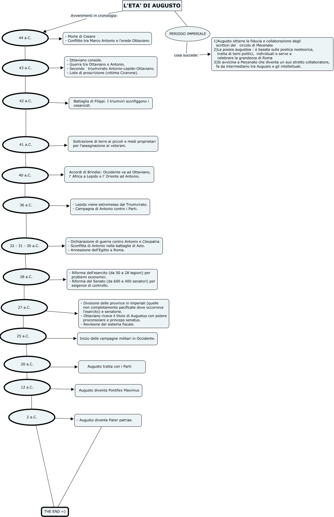 Questa Cmap, creata con IHMC CmapTools, contiene informazioni relative a: Età Augustea (storica)-Gervasoni Adriano, 41 a.C. ???? 40 a.C., - Augusto diventa Pater patriae. ???? THE END =), L'ETA' DI AUGUSTO Avvenimenti in cronologia: 44 a.C., 27 a.C. ???? 25 a.C., 40 a.C. ???? 36 a.C., 41 a.C. ???? Sottrazione di terre ai piccoli e medi proprietari per l'assegnazione ai veterani., 43 a.C. ???? 42 a.C., 28 a.C. ???? 27 a.C., L'ETA' DI AUGUSTO ???? PERIODO IMPERIALE, 25 a.C. ???? Inizio delle campagne militari in Occidente., 43 a.C. ???? - Ottaviano console. - Guerra tra Ottaviano e Antonio. - Secondo triumvirato Antonio-Lepido-Ottaviano. - Liste di proscrizione (vittima Cicerone)., 20 a.C. ???? Augusto tratta con i Parti, 32 - 31 - 30 a.C. ???? 28 a.C., 2 a.C. ???? THE END =), 20 a.C. ???? 12 a.C., 44 a.C. ???? - Morte di Cesare - Conflitto tra Marco Antonio e l'erede Ottaviano, 25 a.C. ???? 20 a.C., 44 a.C. ???? 43 a.C., 28 a.C. ???? - Riforma dell'esercito (da 50 a 28 legioni) per problemi economici. - Riforma del Senato (da 600 a 400 senatori) per esigenze di controllo., 42 a.C. ???? 41 a.C.