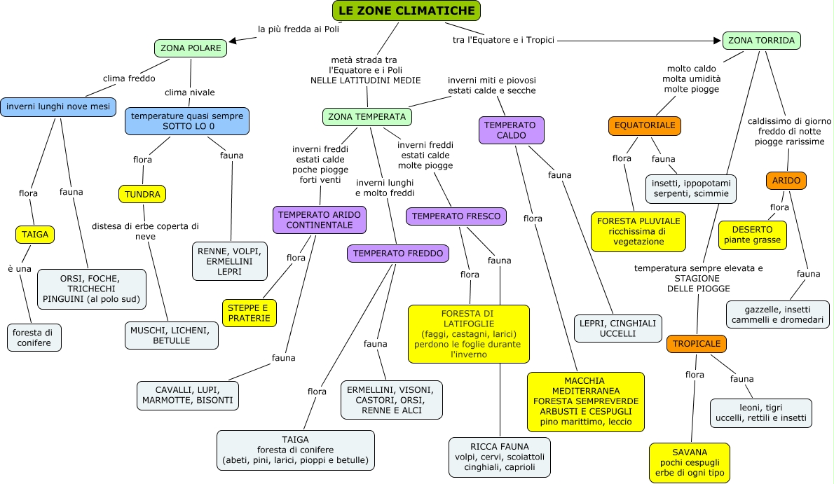 Questa Cmap, creata con IHMC CmapTools, contiene informazioni relative a: Le zone climatiche, ARIDO fauna gazzelle, insetti cammelli e dromedari, TEMPERATO FRESCO fauna RICCA FAUNA volpi, cervi, scoiattoli cinghiali, caprioli, ZONA TEMPERATA inverni lunghi e molto freddi TEMPERATO FREDDO, LE ZONE CLIMATICHE metà strada tra l'Equatore e i Poli NELLE LATITUDINI MEDIE ZONA TEMPERATA, TROPICALE fauna leoni, tigri uccelli, rettili e insetti, ZONA TEMPERATA inverni freddi estati calde molte piogge TEMPERATO FRESCO, ZONA TEMPERATA inverni freddi estati calde poche piogge forti venti TEMPERATO ARIDO CONTINENTALE, ZONA POLARE clima nivale temperature quasi sempre SOTTO LO 0, LE ZONE CLIMATICHE tra l'Equatore e i Tropici ZONA TORRIDA, TEMPERATO FREDDO fauna ERMELLINI, VISONI, CASTORI, ORSI, RENNE E ALCI, TROPICALE flora SAVANA pochi cespugli erbe di ogni tipo, TEMPERATO FRESCO flora FORESTA DI LATIFOGLIE (faggi, castagni, larici) perdono le foglie durante l'inverno, temperature quasi sempre SOTTO LO 0 fauna RENNE, VOLPI, ERMELLINI LEPRI, temperature quasi sempre SOTTO LO 0 flora TUNDRA, TEMPERATO CALDO flora MACCHIA MEDITERRANEA FORESTA SEMPREVERDE ARBUSTI E CESPUGLI pino marittimo, leccio, TEMPERATO CALDO fauna LEPRI, CINGHIALI UCCELLI, TUNDRA distesa di erbe coperta di neve MUSCHI, LICHENI, BETULLE, TEMPERATO ARIDO CONTINENTALE flora STEPPE E PRATERIE, EQUATORIALE fauna insetti, ippopotami serpenti, scimmie, inverni lunghi nove mesi flora TAIGA
