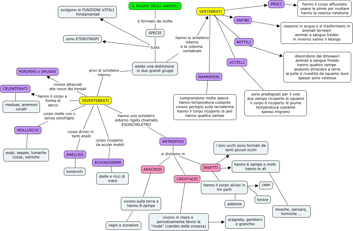 Questa Cmap, creata con IHMC CmapTools, contiene informazioni relative a: Il regno degli animali, INVERTEBRATI vivono attaccati alle rocce dei fondali PORIFERI o SPUGNE, SPECIE tutte svolgono le FUNZIONI VITALI fondamentali, VERTEBRATI ???? UCCELLI, esiste una distinzione in due grandi gruppi hanno lo scheletro interno e la colonna vertebrale VERTEBRATI, INVERTEBRATI hanno il corpo a forma di sacco CELENTERATI, vivono sulla terra e hanno 8 zampe ???? ragni e scorpioni, INVERTEBRATI corpo ricoperto da aculei mobili ECHINODERMI, ANELLIDI ???? lombrichi, VERTEBRATI ???? MAMMIFERI, SPECIE tutte sono ETEROTROFI, VERTEBRATI ???? ANFIBI, vivono in mare e periodicamente fanno la "muta" (cambio della corazza) ???? aragosta, gambero e granchio, IL REGNO DEGLI ANIMALI è formato da molte SPECIE, SPECIE tutte esiste una distinzione in due grandi gruppi, VERTEBRATI ???? PESCI, ANFIBI ???? nascono in acqua e si trasformano in animali terrestri animali a sangue freddo in inverno vanno il letargo, CELENTERATI ???? meduse, anemoni coralli, ARTROPODI si dividono in INSETTI, INSETTI ???? i loro occhi sono formati da tanti piccoli occhi, MAMMIFERI ???? comprendono molte specie hanno temperatura costante vivono perlopiù sulla terraferma hanno il corpo ricoperto di peli hanno quattro zampe