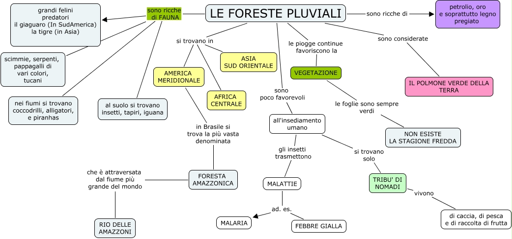 Questa Cmap, creata con IHMC CmapTools, contiene informazioni relative a: La foresta pluviale, LE FORESTE PLUVIALI sono ricche di petrolio, oro e soprattutto legno pregiato, all'insediamento umano gli insetti trasmettono MALATTIE, LE FORESTE PLUVIALI sono ricche di FAUNA al suolo si trovano insetti, tapiri, iguana, LE FORESTE PLUVIALI sono poco favorevoli all'insediamento umano, LE FORESTE PLUVIALI sono ricche di FAUNA scimmie, serpenti, pappagalli di vari colori, tucani, LE FORESTE PLUVIALI le piogge continue favoriscono la VEGETAZIONE, VEGETAZIONE le foglie sono sempre verdi NON ESISTE LA STAGIONE FREDDA, AMERICA MERIDIONALE in Brasile si trova la più vasta denominata FORESTA AMAZZONICA, LE FORESTE PLUVIALI sono considerate IL POLMONE VERDE DELLA TERRA, LE FORESTE PLUVIALI sono ricche di FAUNA grandi felini predatori il giaguaro (In SudAmerica) la tigre (in Asia), MALATTIE ad. es. FEBBRE GIALLA, LE FORESTE PLUVIALI si trovano in ASIA SUD ORIENTALE, FORESTA AMAZZONICA che è attraversata dal fiume più grande del mondo RIO DELLE AMAZZONI, LE FORESTE PLUVIALI si trovano in AMERICA MERIDIONALE, TRIBU' DI NOMADI vivono di caccia, di pesca e di raccolta di frutta, all'insediamento umano si trovano solo TRIBU' DI NOMADI, MALATTIE ad. es. MALARIA, LE FORESTE PLUVIALI si trovano in AFRICA CENTRALE, LE FORESTE PLUVIALI sono ricche di FAUNA nei fiumi si trovano coccodrilli, alligatori, e piranhas