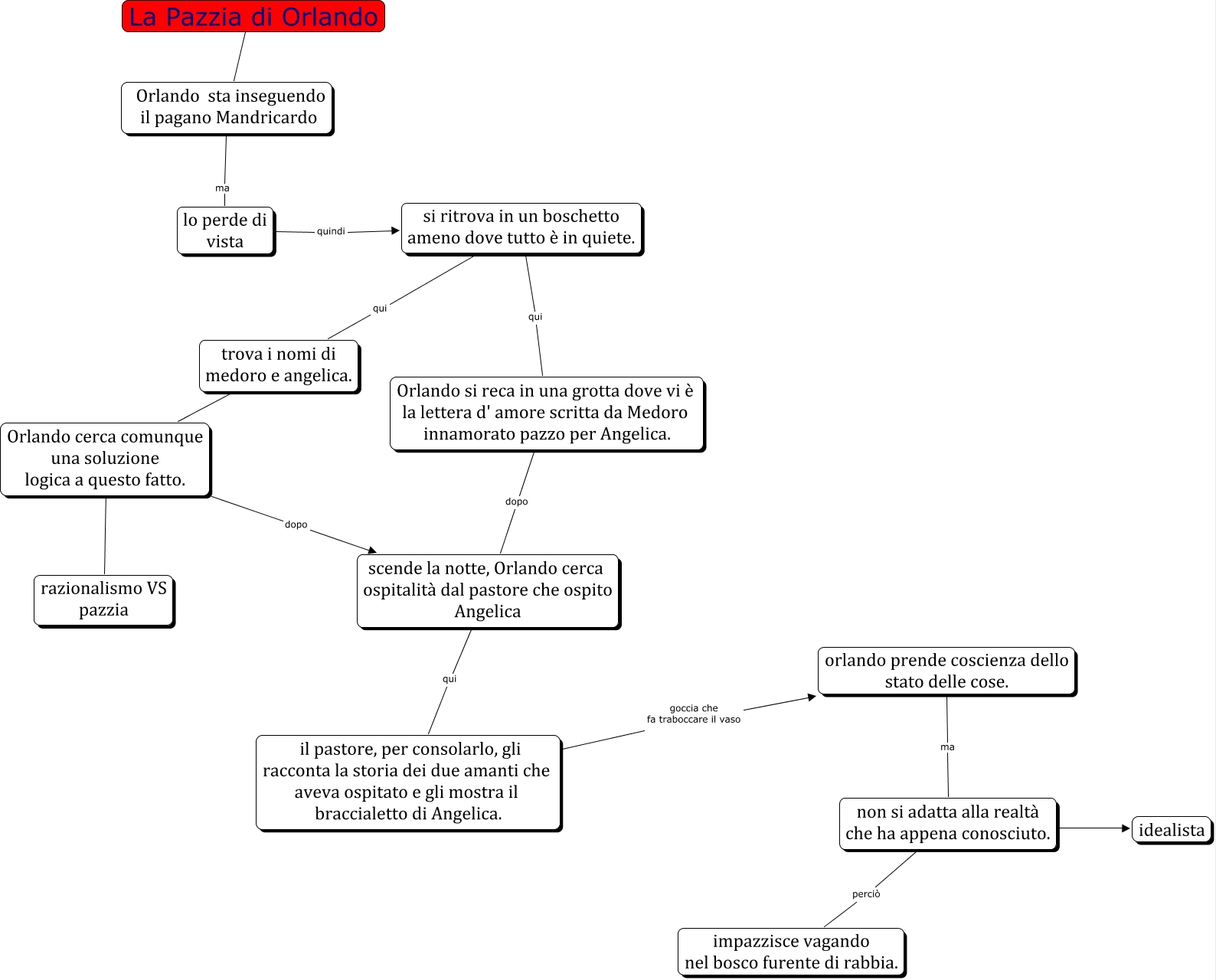Questa Cmap, creata con IHMC CmapTools, contiene informazioni relative a: pazzia di Orlando Plevani, Orlando si reca in una grotta dove vi è la lettera d' amore scritta da Medoro innamorato pazzo per Angelica. dopo scende la notte, Orlando cerca ospitalità dal pastore che ospito Angelica, lo perde di vista quindi si ritrova in un boschetto ameno dove tutto è in quiete., si ritrova in un boschetto ameno dove tutto è in quiete. qui Orlando si reca in una grotta dove vi è la lettera d' amore scritta da Medoro innamorato pazzo per Angelica., La Pazzia di Orlando ???? Orlando sta inseguendo il pagano Mandricardo, il pastore, per consolarlo, gli racconta la storia dei due amanti che aveva ospitato e gli mostra il braccialetto di Angelica. goccia che fa traboccare il vaso orlando prende coscienza dello stato delle cose., trova i nomi di medoro e angelica. ???? Orlando cerca comunque una soluzione logica a questo fatto., Orlando sta inseguendo il pagano Mandricardo ma lo perde di vista, Orlando cerca comunque una soluzione logica a questo fatto. ???? razionalismo VS pazzia, orlando prende coscienza dello stato delle cose. ma non si adatta alla realtà che ha appena conosciuto., si ritrova in un boschetto ameno dove tutto è in quiete. qui trova i nomi di medoro e angelica., non si adatta alla realtà che ha appena conosciuto. perciò impazzisce vagando nel bosco furente di rabbia., non si adatta alla realtà che ha appena conosciuto. ???? idealista, scende la notte, Orlando cerca ospitalità dal pastore che ospito Angelica qui il pastore, per consolarlo, gli racconta la storia dei due amanti che aveva ospitato e gli mostra il braccialetto di Angelica., Orlando cerca comunque una soluzione logica a questo fatto. dopo scende la notte, Orlando cerca ospitalità dal pastore che ospito Angelica