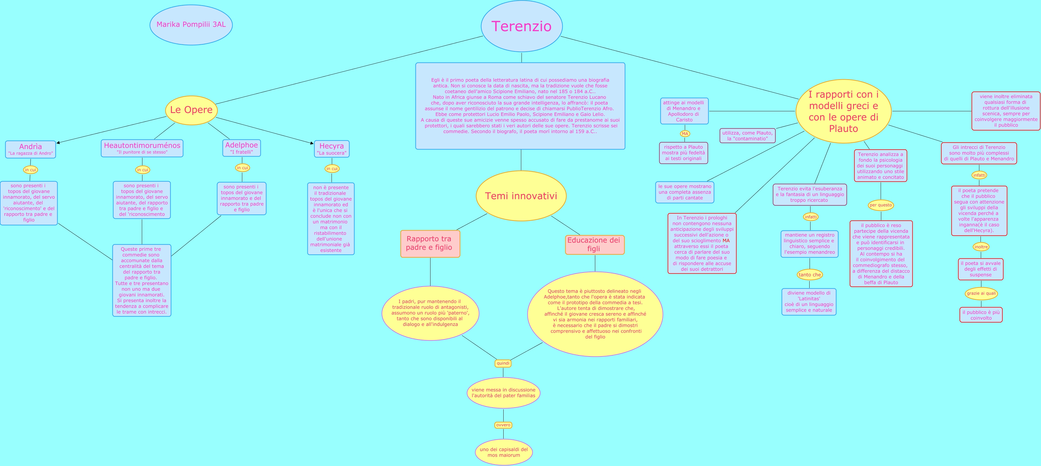 Questa Cmap, creata con IHMC CmapTools, contiene informazioni relative a: Terenzio Marika Pompilii, Terenzio I rapporti con i modelli greci e con le opere di Plauto utilizza, come Plauto, la "contaminatio", Terenzio analizza a fondo la psicologia dei suoi personaggi utilizzando uno stile animato e concitato per questo il pubblico è reso partecipe della vicenda che viene rappresentata e può identificarsi in personaggi credibili. Al contempo si ha il coinvolgimento del commediografo stesso, a differenza del distacco di Menandro e della beffa di Plauto, sono presenti i topos del giovane innamorato e del rapporto tra padre e figlio ???? Queste prime tre commedie sono accomunate dalla centralità del tema del rapporto tra padre e figlio. Tutte e tre presentano non uno ma due giovani innamorati. Si presenta inoltre la tendenza a complicare le trame con intrecci., Terenzio I rapporti con i modelli greci e con le opere di Plauto Terenzio analizza a fondo la psicologia dei suoi personaggi utilizzando uno stile animato e concitato, I padri, pur mantenendo il tradizionale ruolo di antagonisti, assumono un ruolo più 'paterno', tanto che sono disponibili al dialogo e all'indulgenza quindi viene messa in discussione l'autorità del pater familias, Terenzio I rapporti con i modelli greci e con le opere di Plauto le sue opere mostrano una completa assenza di parti cantate, attinge ai modelli di Menandro e Apollodoro di Caristo MA rispetto a Plauto mostra più fedeltà ai testi originali, Terenzio I rapporti con i modelli greci e con le opere di Plauto Terenzio evita l'esuberanza e la fantasia di un linguaggio troppo ricercato, Terenzio Le Opere Heautontimoruménos "Il punitore di se stesso", Terenzio evita l'esuberanza e la fantasia di un linguaggio troppo ricercato infatti mantiene un registro linguistico semplice e chiaro, seguendo l'esempio menandreo, Terenzio I rapporti con i modelli greci e con le opere di Plauto Gli intrecci di Terenzio sono molto più complessi di quelli di Plauto e Menandro, Questo tema è piuttosto delineato negli Adelphoe,tanto che l'opera è stata indicata come il prototipo della commedia a tesi. L'autore tenta di dimostrare che, affinché il giovane cresca sereno e affinché vi sia armonia nei rapporti familiari, è necessario che il padre si dimostri comprensivo e affettuoso nei confronti del figlio viene messa in discussione l'autorità del pater familias, Heautontimoruménos "Il punitore di se stesso" in cui sono presenti i topos del giovane innamorato, del servo aiutante, del rapporto tra padre e figlio e del 'riconoscimento, Terenzio I rapporti con i modelli greci e con le opere di Plauto viene inoltre eliminata qualsiasi forma di rottura dell'illusione scenica, sempre per coinvolgere maggiormente il pubblico, Adelphoe "I fratelli" in cui sono presenti i topos del giovane innamorato e del rapporto tra padre e figlio, Terenzio Le Opere Andrìa "La ragazza di Andro", Terenzio I rapporti con i modelli greci e con le opere di Plauto attinge ai modelli di Menandro e Apollodoro di Caristo, sono presenti i topos del giovane innamorato, del servo aiutante, del rapporto tra padre e figlio e del 'riconoscimento ???? Queste prime tre commedie sono accomunate dalla centralità del tema del rapporto tra padre e figlio. Tutte e tre presentano non uno ma due giovani innamorati. Si presenta inoltre la tendenza a complicare le trame con intrecci., Terenzio I rapporti con i modelli greci e con le opere di Plauto In Terenzio i prologhi non contengono nessuna anticipazione degli sviluppi successivi dell'azione o del suo scioglimento MA attraverso essi il poeta cerca di parlare del suo modo di fare poesia e di rispondere alle accuse dei suoi detrattori, Terenzio Le Opere Hecyra "La suocera"