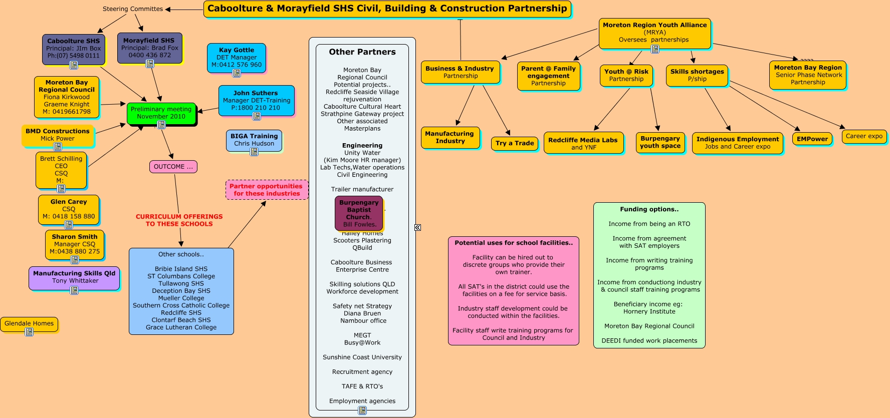 This Concept Map, created with IHMC CmapTools, has information related to: Caboolture & MorayfieldCivil Building & Construction Partnership, Moreton Region Youth Alliance (MRYA) Oversees partnerships ???? Youth @ Risk Partnership, Caboolture & Morayfield SHS Civil, Building & Construction Partnership Steering Committes Caboolture SHS Principal: JIm Box Ph:(07) 5498 0111, OUTCOME ... CURRICULUM OFFERINGS TO THESE SCHOOLS Other schools.. Bribie Island SHS ST Columbans College Tullawong SHS Deception Bay SHS Mueller College Southern Cross Catholic College Redcliffe SHS Clontarf Beach SHS Grace Lutheran College, Skills shortages P/ship ???? Indigenous Employment Jobs and Career expo, Moreton Region Youth Alliance (MRYA) Oversees partnerships ???? Business & Industry Partnership, Other schools.. Bribie Island SHS ST Columbans College Tullawong SHS Deception Bay SHS Mueller College Southern Cross Catholic College Redcliffe SHS Clontarf Beach SHS Grace Lutheran College ???? Partner opportunities for these industries, Morayfield SHS Principal: Brad Fox 0400 436 872 ???? Preliminary meeting November 2010, Youth @ Risk Partnership ???? Redcliffe Media Labs and YNF, Moreton Region Youth Alliance (MRYA) Oversees partnerships ???? Moreton Bay Region Senior Phase Network Partnership, Moreton Region Youth Alliance (MRYA) Oversees partnerships ???? Skills shortages P/ship, Moreton Region Youth Alliance (MRYA) Oversees partnerships ???? Parent @ Family engagement Partnership, BMD Constructions Mick Power ???? Preliminary meeting November 2010, Caboolture & Morayfield SHS Civil, Building & Construction Partnership Steering Committes Morayfield SHS Principal: Brad Fox 0400 436 872, Business & Industry Partnership ???? Caboolture & Morayfield SHS Civil, Building & Construction Partnership, Moreton Bay Regional Council Fiona Kirkwood Graeme Knight M: 0419661798 ???? Preliminary meeting November 2010, Youth @ Risk Partnership ???? Burpengary youth space, Business & Industry Partnership ???? Manufacturing Industry, Skills shortages P/ship ???? EMPower, Caboolture SHS Principal: JIm Box Ph:(07) 5498 0111 ???? Preliminary meeting November 2010, Business & Industry Partnership ???? Try a Trade